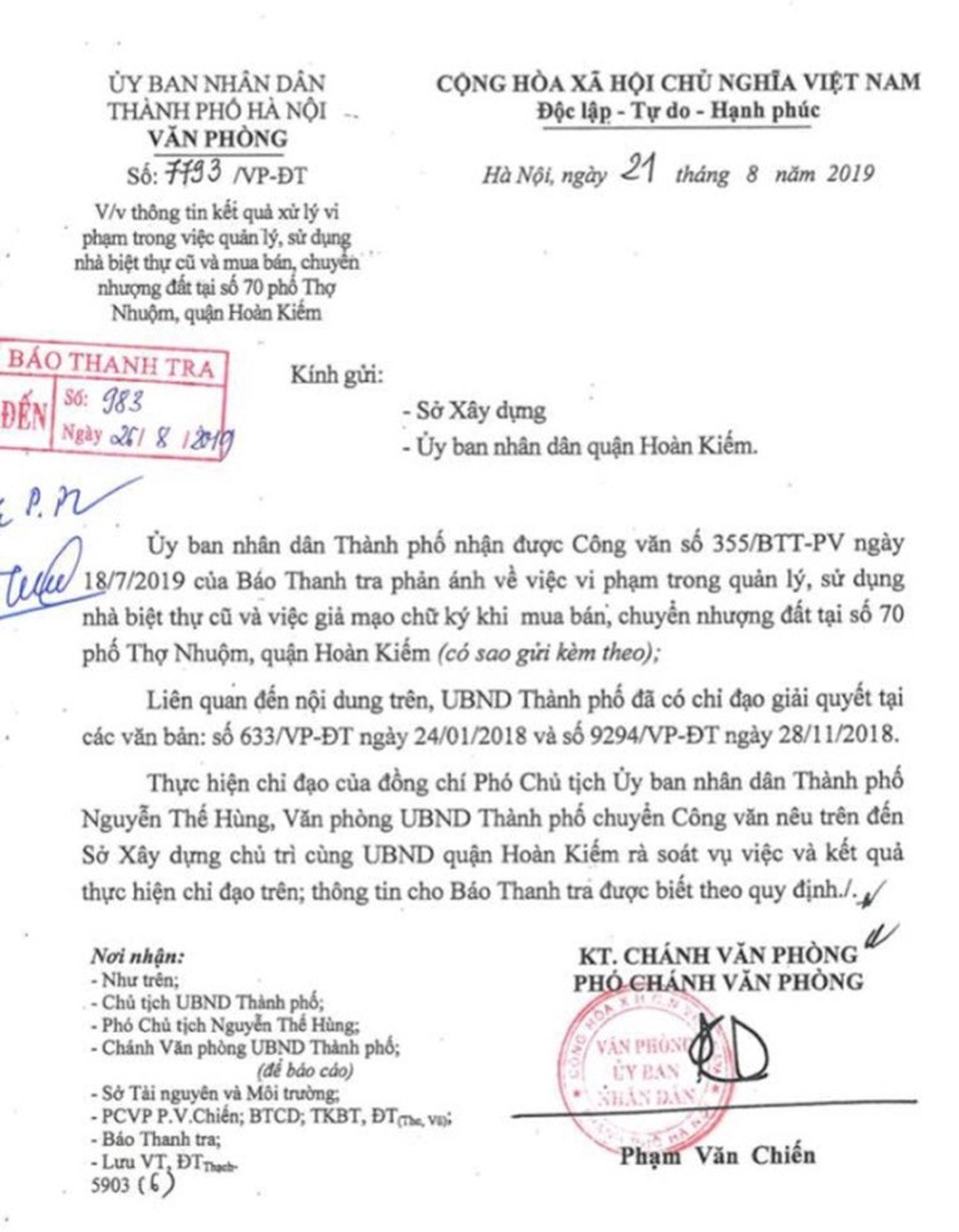 Ngày 21/8/2019, Văn phòng UBND TP Hà Nội có Văn bản số 7793/VP-ĐT về việc thông tin kết quả xử lý vi phạm trong việc quản lý, sử dụng nhà biệt thự cũ và mua bán, chuyển nhượng đất tại số 70 phố Thợ Nhuộm, quận Hoàn Kiếm gửi Sở Xây dựng và UBND quận Hoàn Kiếm.
