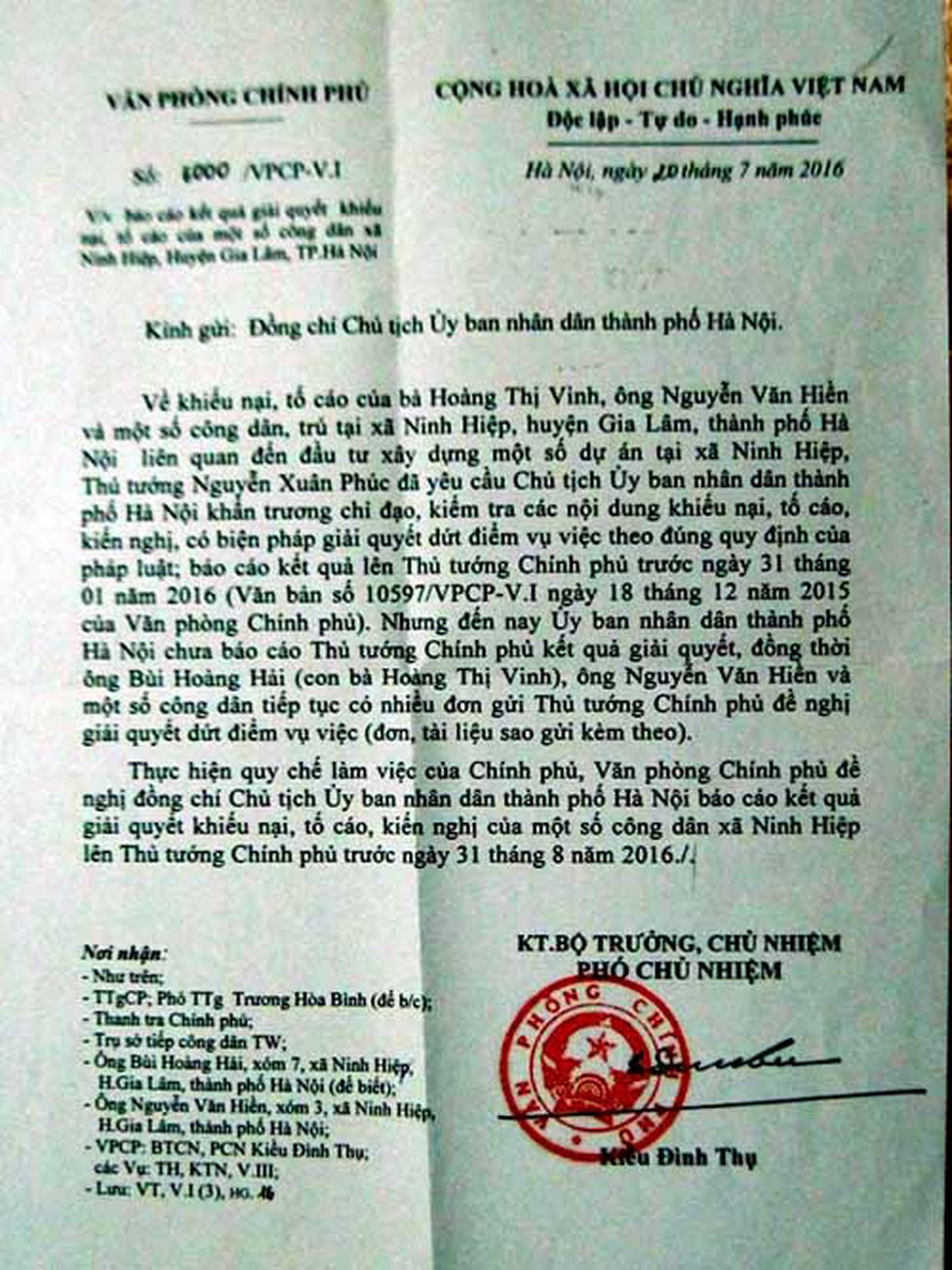 Văn bản trên nêu rõ: Về khiếu nại, tố cáo của bà Hoàng Thị Vinh, ông Nguyễn Văn Hiền và một số công dân trú tại xã Ninh Hiệp, huyện Gia Lâm liên quan đến đầu tư xây dựng một số dự án tại xã Ninh Hiệp, Thủ tướng Nguyễn Xuân Phúc đã yêu cầu Chủ tịch UBND TP Hà Nội khẩn trương chỉ đạo, kiểm tra các nội dung khiếu nại, tố cáo, kiến nghị, có biện pháp giải quyết dứt điểm vụ việc theo đúng quy định của pháp luật; báo cáo kết quả lên Thủ tướng Chính phủ trước ngày 31/1/2016 (Văn bản số 10597/VPCP-V.I ngày 18/12/2015 của Văn phòng Chính phủ). Nhưng, đến nay, UBND TP Hà Nội chưa báo cáo Thủ tướng Chính phủ kết quả giải quyết, đồng thời ông Bùi Hoàng Hải (con bà Hoàng Thị Vinh), ông Nguyễn Văn Hiền và một số công dân tiếp tục có nhiều đơn gửi Thủ tướng Chính phủ đề nghị giải quyết dứt điểm vụ việc.