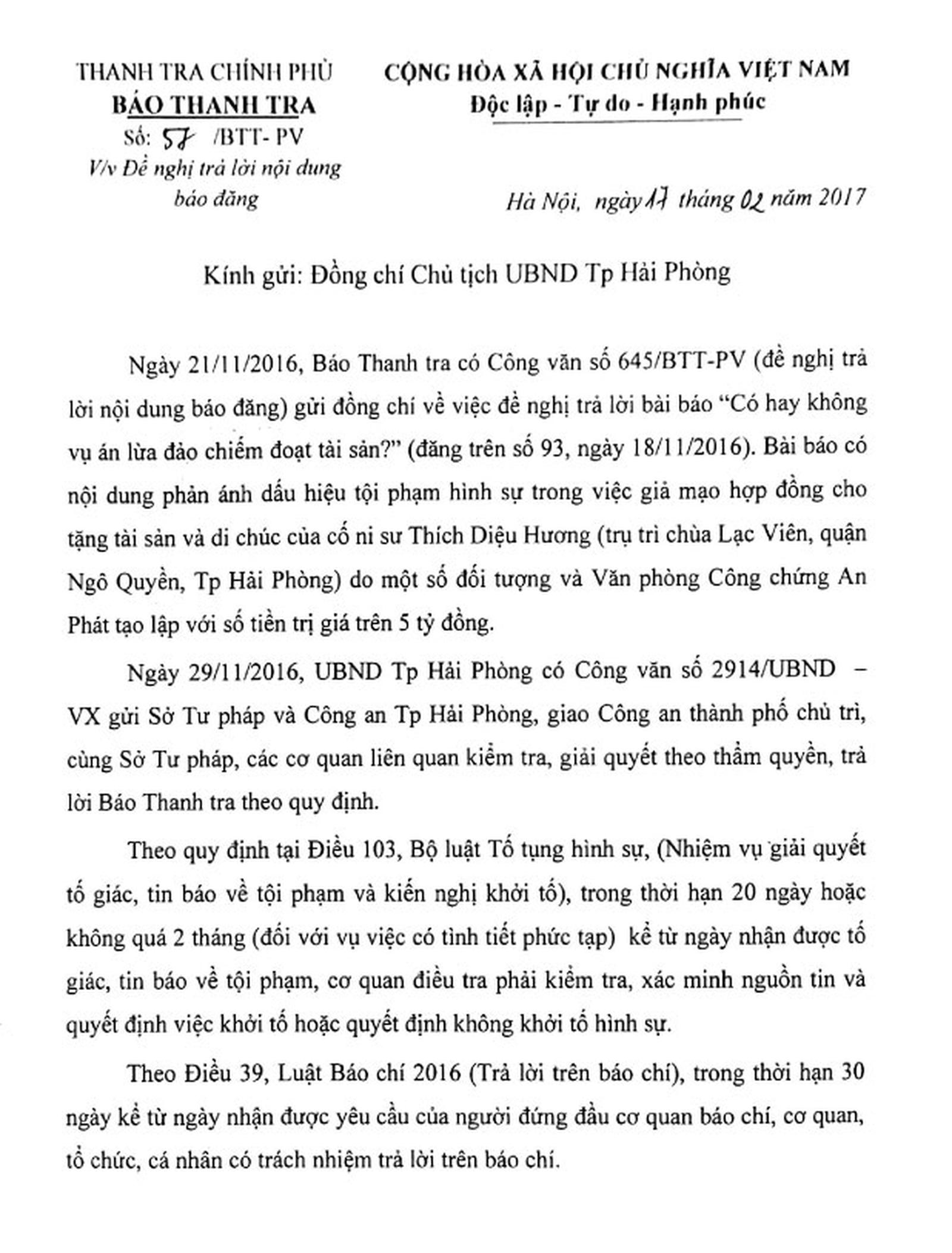 Công văn của Báo Thanh tra gửi Chủ tịch UBND TP Hải Phòng