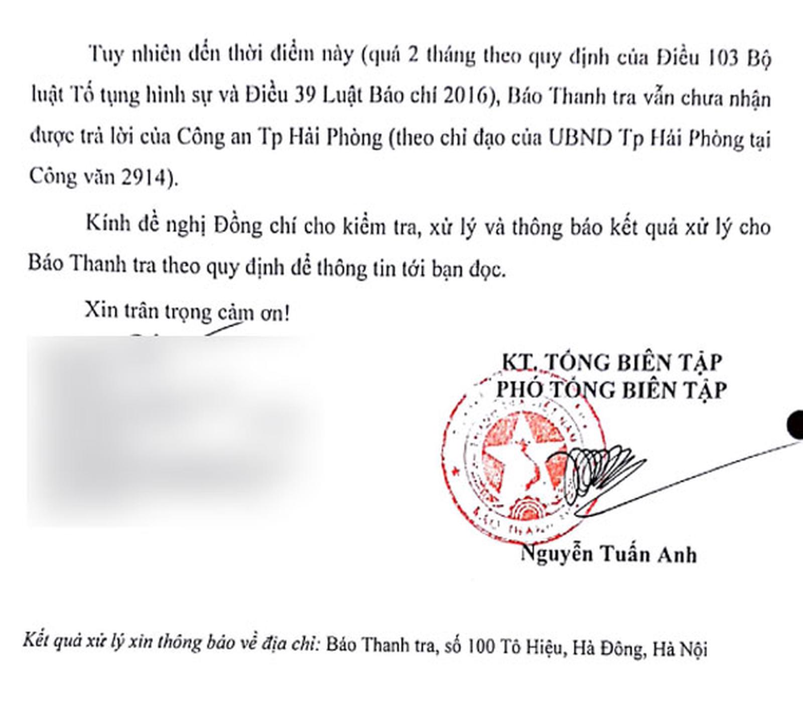 Mặc dù đã có văn bản chỉ đạo nhiều lần của UBND TP Hải Phòng, nhưng đến thời điểm này Công an thành phố vẫn chưa trả lời Báo Thanh tra về kết quả giải quyết vụ việc.