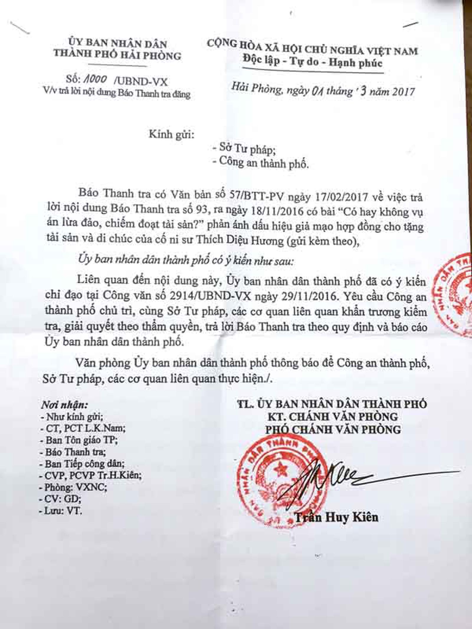 Với bài “Có hay không vụ án lừa đảo, chiếm đoạt tài sản?” (ngày 18/11/2016) chúng tôi đã phản ánh rõ dấu hiệu làm giả di chúc và hợp đồng cho tặng này. Sau khi bài báo phát hành, UBND TP Hải Phòng nhiều lần khẳng định (Văn bản 2914/UBND-VX ngày 29/11/2016 và Văn bản 1000/UBND-VX ngày 1/3/2017) đã giao Công an TP cùng Sở Tư pháp giải quyết, trả lời Báo Thanh tra. Đến nay, chúng tôi vẫn chưa nhận được sự hồi âm, kết quả giải quyết vụ việc.