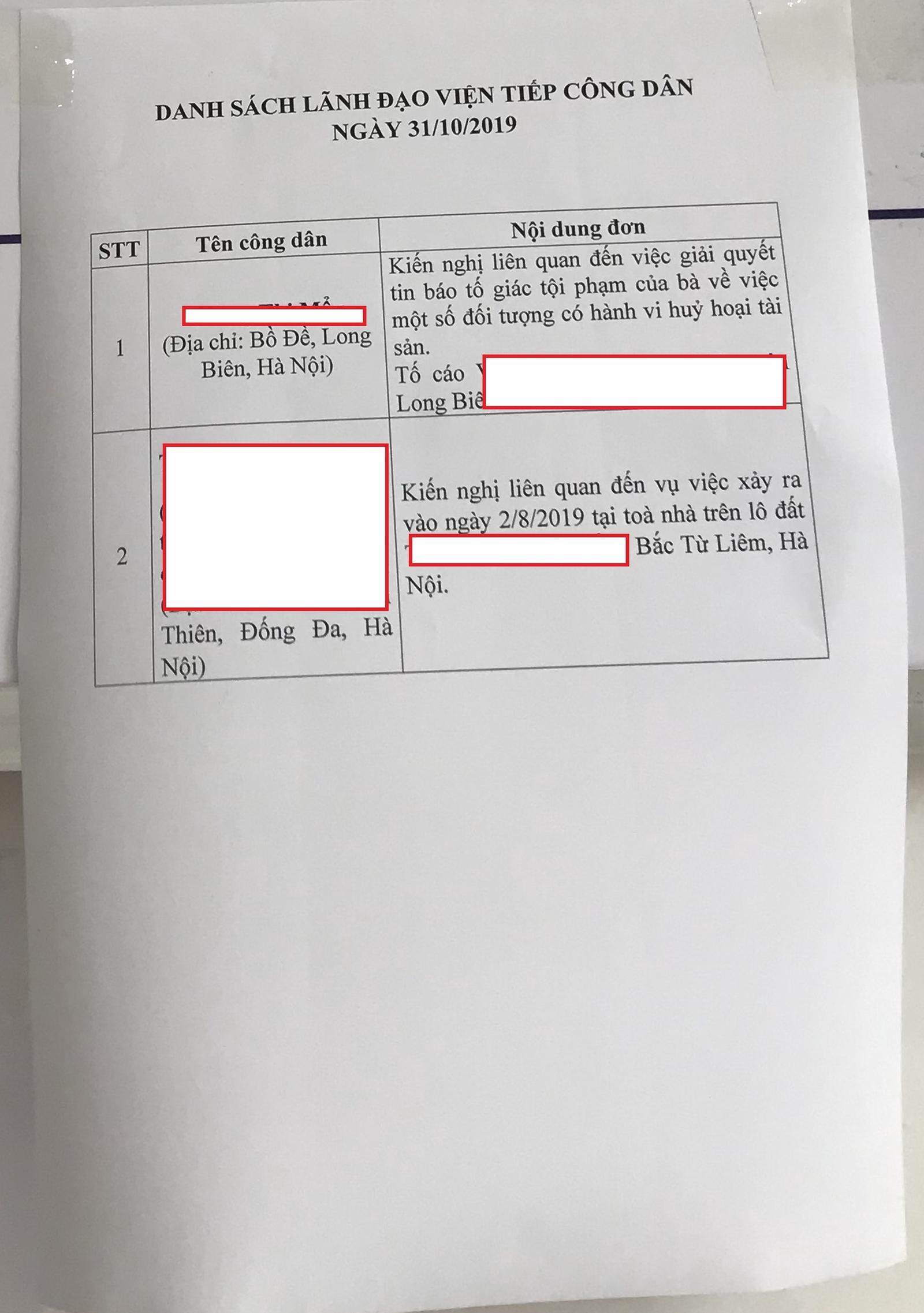 Tại buổi tiếp công dân định kì tháng 10/2019 vào thứ năm, ngày 31/10/2019, công dân đã cung cấp nội dung bài báo và tiếp tục yêu cầu trao trả biên bản buổi tiếp công dân vào ngày 28/2/2019, đồng thời đề nghị được thực hiện gặp lãnh đạo Viện KSND TP Hà Nội theo lịch tiếp định kì tháng 10/2019 đã công bố trên website.