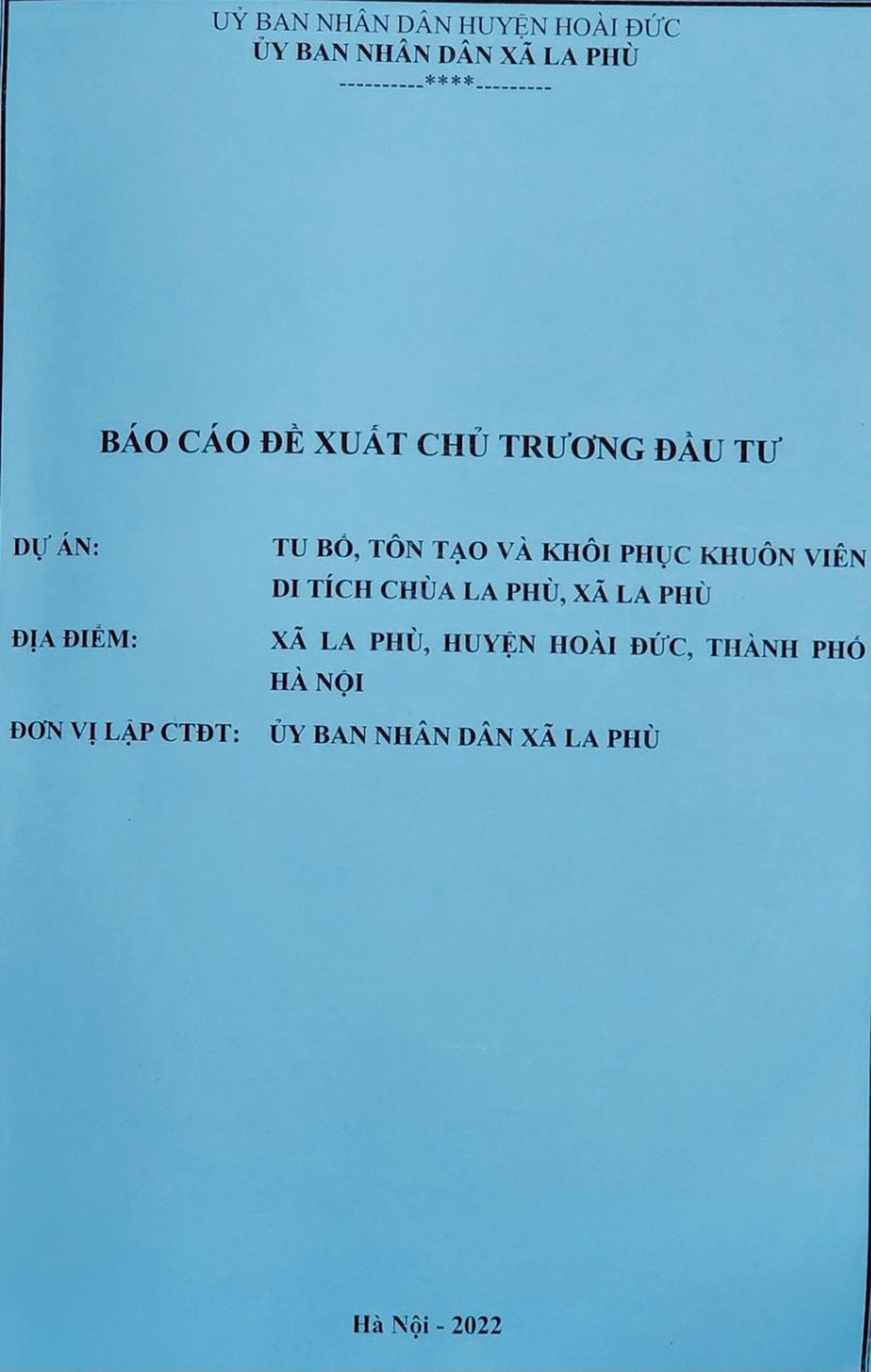 Báo cáo đề xuất chủ trương đầu tư dự án tu bổ, tôn tạo và khôi phục khuôn viên di tích chùa La Phù. Ảnh: TQ