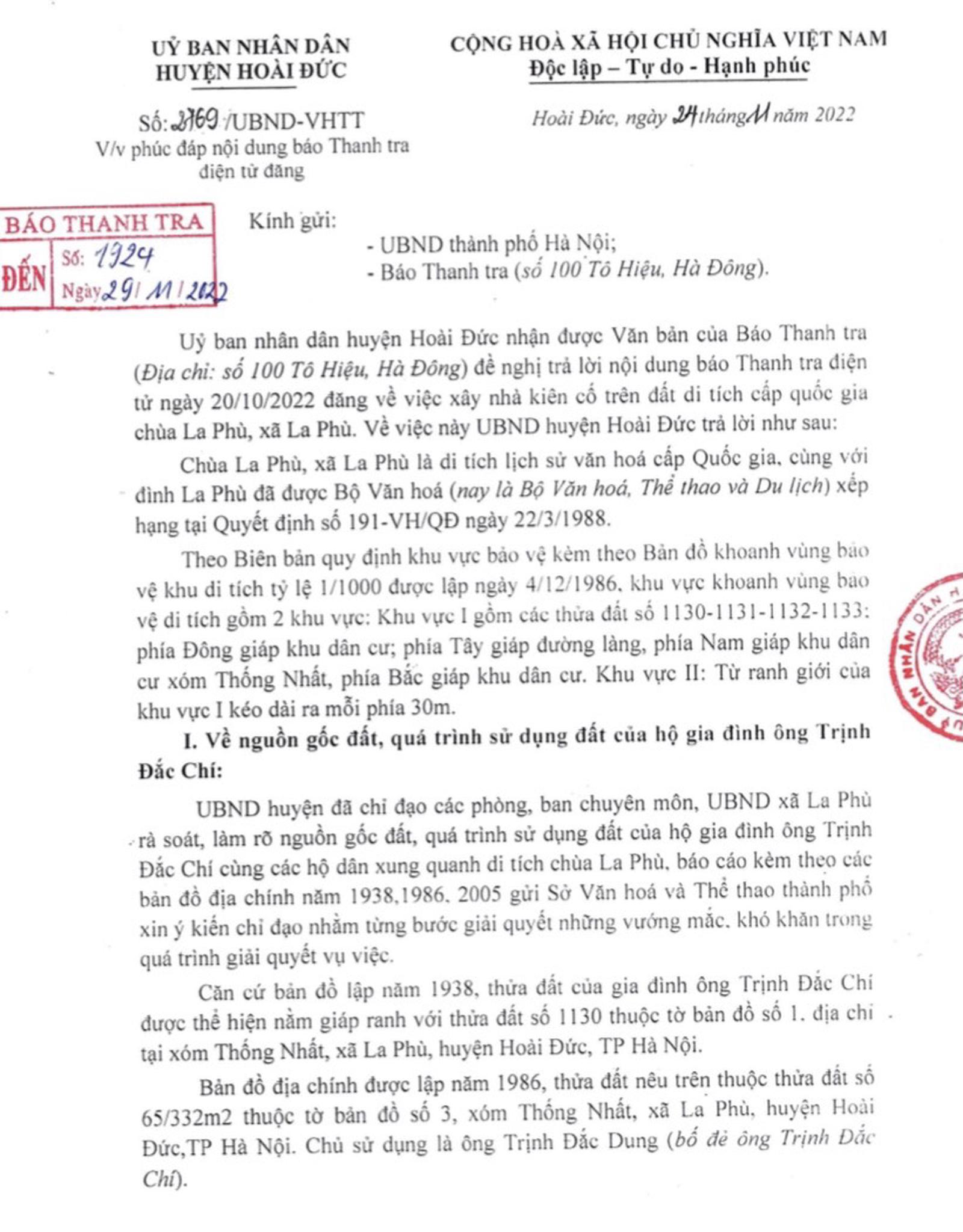 Ngày 24/11/2022, UBND huyện Hoài Đức có Văn bản số 2769 phúc đáp nội dung Báo Thanh tra đăng tải, cho biết, đã chỉ đạo các phòng, ban chuyên môn, UBND xã La Phù rà soát, làm rõ nguồn gốc đất, quá trình sử dụng đất của hộ gia đình ông Trịnh Đắc Chí cùng các hộ dân xung quanh di tích chùa La Phù.
