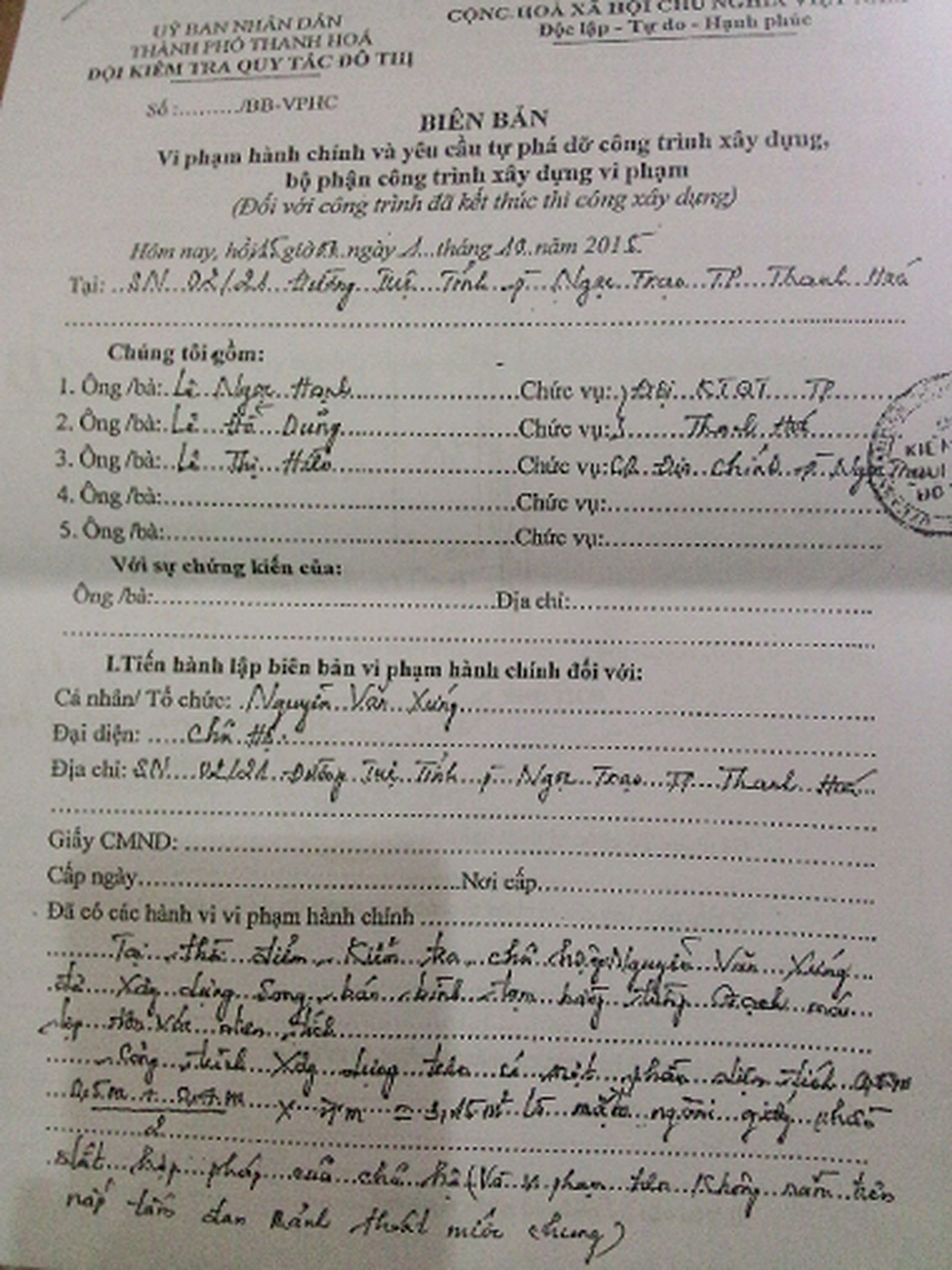 Ngày 1/10/2015, Đội Kiểm tra Quy tắc Đô thị đã đến hiện trường kiểm tra hiện trạng khu đất và lập biên bản khẳng định: “Tại thời điểm kiểm tra, hộ ông Xứng đã xây dựng bán bình tạm bằng tường gạch, mái lợp tôn với diện tích 3,15m2, nằm ngoài diện tích đất hợp pháp của hộ ông Xứng. Các bên thống nhất yêu cầu hộ ông Xứng phải tháo dỡ phần xây dựng trái phép trên đất công, thời gian chậm nhất là 10 ngày (trước ngày 23/10/2015)”.