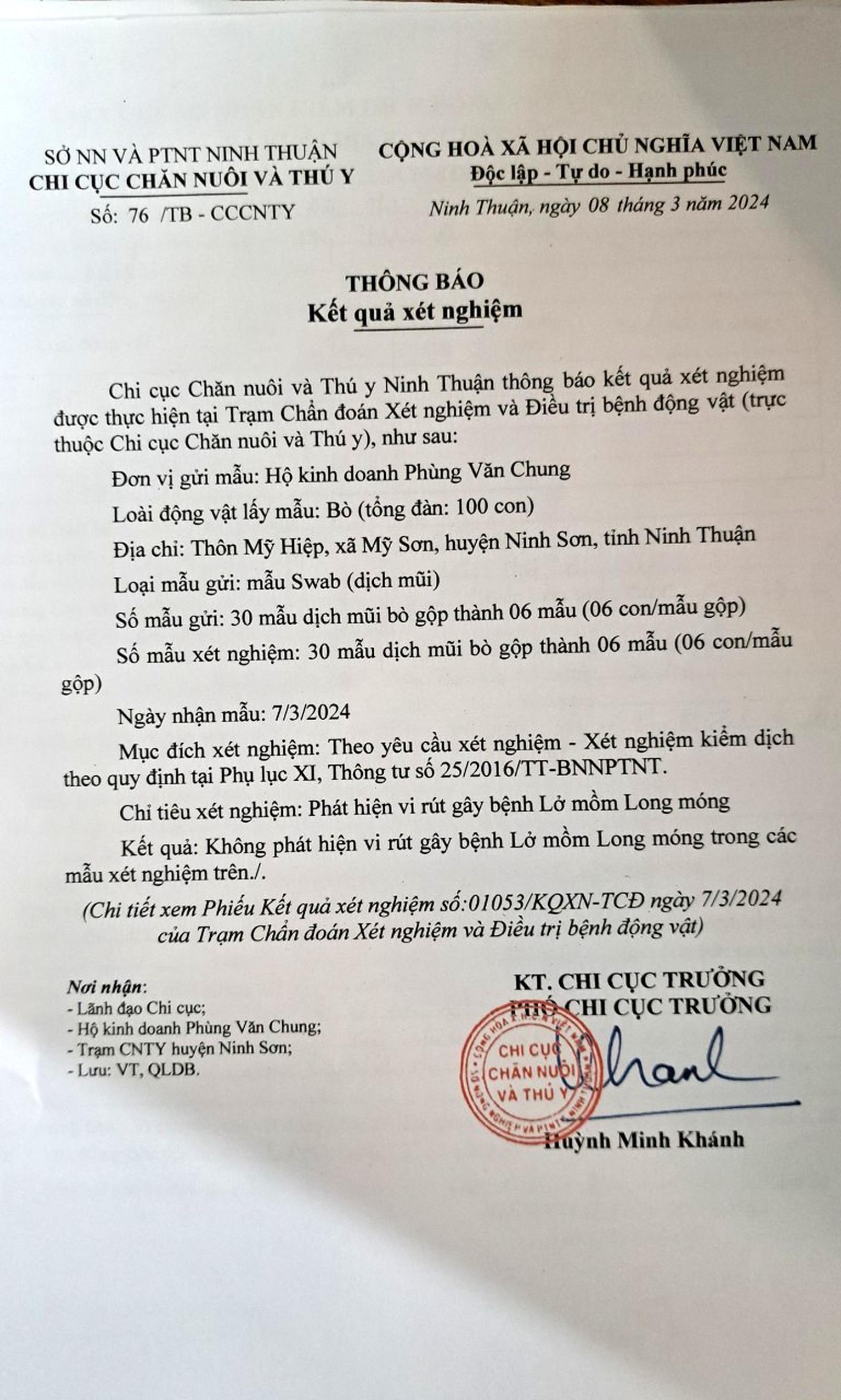 Đồng thời, trong chính hồ sơ mà UBND các xã cung cấp cho UBND huyện thì số bò này vừa được Chi cục Chăn nuôi và Thú y (Sở Nông nghiệp và Phát triển nông thôn tỉnh Ninh Thuận) thông báo kết quả xét nghiệm cho hộ kinh doanh Phùng Văn Chung (trú tại thôn Mỹ Hiệp, xã Mỹ Sơn, huyện Ninh Sơn, tỉnh Ninh Thuận) vào ngày 8/3/2024. Chưa đầy 10 ngày sau, đến ngày 17/3/2024, số bò này được cấp cho người dân các thôn của xã Húc và xã Hướng Lộc.