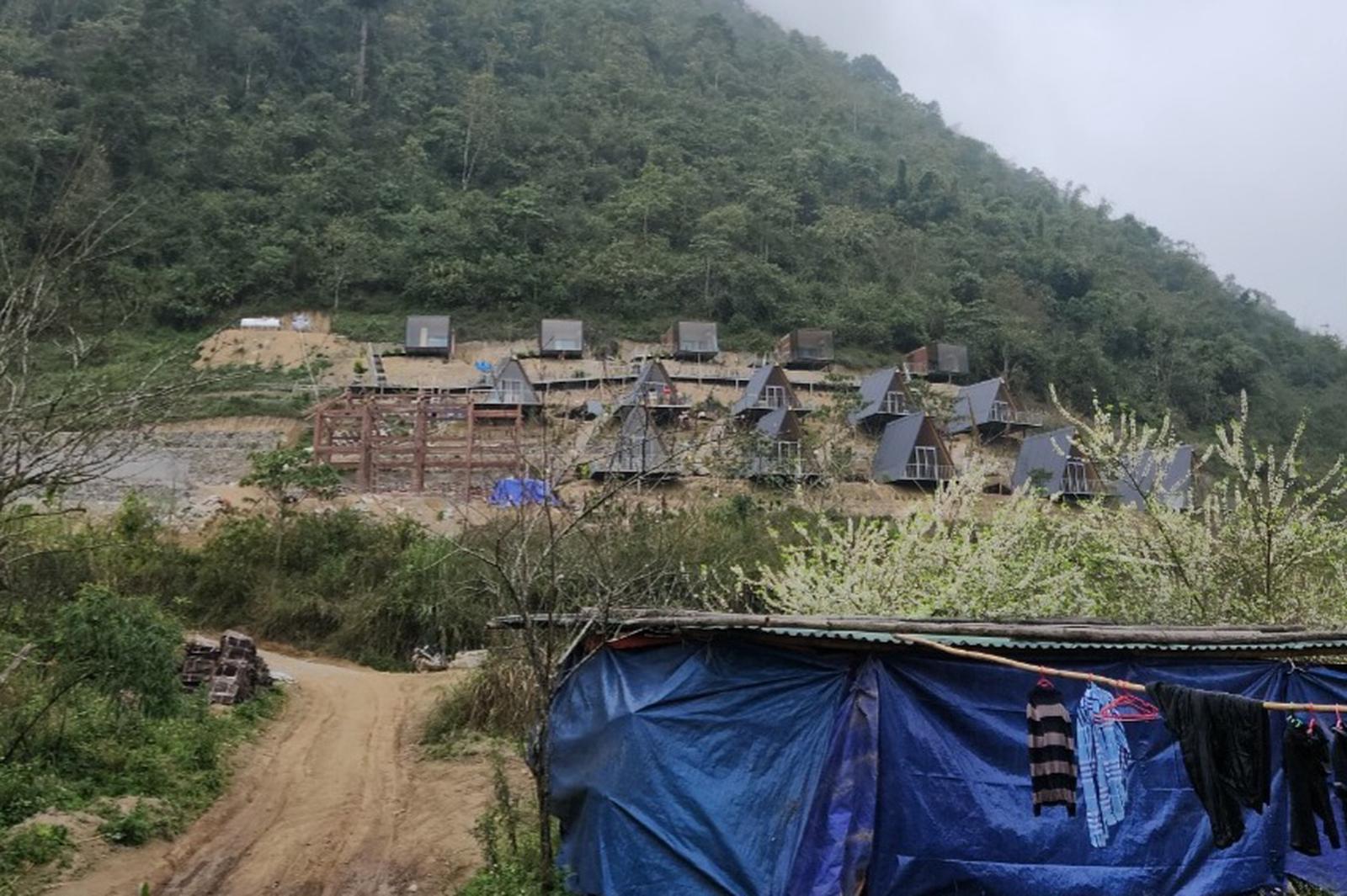 Kiểm tra hiện trạng sử dụng đất và xây dựng cho thấy, thửa số 30 đang sử dụng làm nông nghiệp đúng mục đích; các thửa 60, 61, 62 và 64 có tổng diện tích 7.778,1m2 đang xây dựng các hạng mục công trình, vật kiến trúc, trồng cây tạo cảnh quan gồm: 3 nhà sàn, 1 nhà giặt, 17 căn nhà lắp ghép và hệ thống đường, bậc thang đến các căn nhà ghép, bể nước… Các hạng mục này đang ở mức độ triển khai xây dựng, chưa thực hiện kinh doanh.