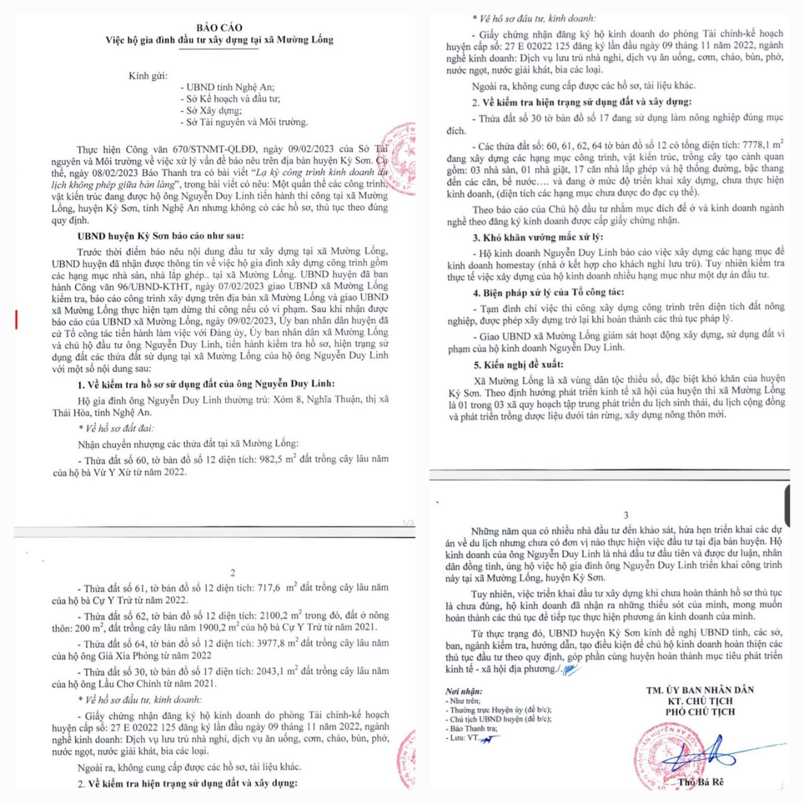 Theo báo cáo này, sau khi tiếp nhận thông tin báo đăng và báo cáo từ xã Mường Lống, tổ công tác đã tiến hành làm việc với Đảng ủy, UBND xã và chủ hộ đầu tư là ông Nguyễn Duy Linh (hộ khẩu thường trú xóm 8, xã Nghĩa Thuận, thị xã Thái Hòa), đồng thời tiến hành kiểm tra hồ sơ, hiện trạng sử dụng đất các thửa đất sử dụng tại xã Mường Lống của hộ ông Linh.