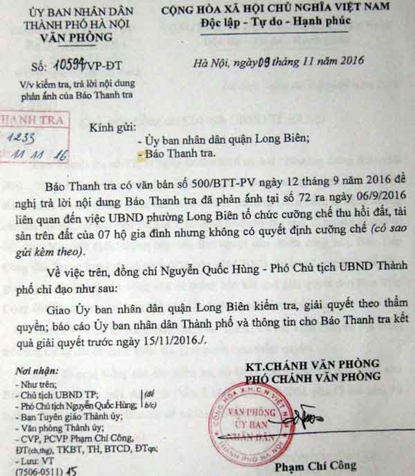Ngày 9/11/2016, UBND TP Hà Nội đã ban hành Văn bản số 10594 về việc kiểm tra, trả lời nội dung phản ánh của Báo Thanh tra gửi UBND quận Long Biên. Ông Nguyễn Quốc Hùng, Phó Chủ tịch UBND TP chỉ đạo, giao UBND quận Long Biên kiểm tra, giải quyết theo thẩm quyền, báo cáo UBND TP và thông tin cho Báo Thanh tra kết quả giải quyết trước ngày 15/11/2016.