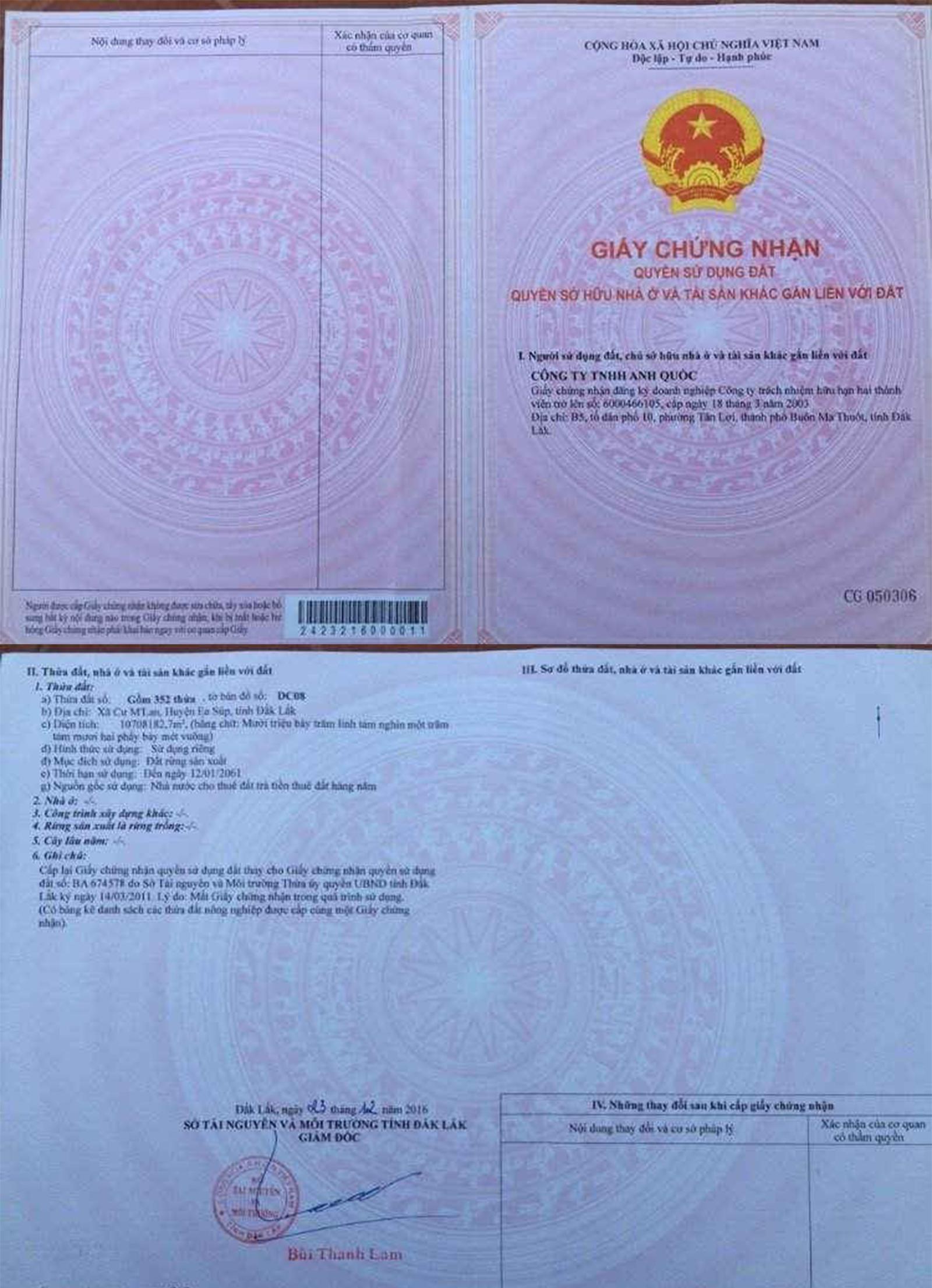 Sau khi có quyết định giao đất, ngày 14/3/2011, thừa ủy quyền của Chủ tịch UBND tỉnh, Giám đốc Sở Tài nguyên và Môi trường (TN&MT) tỉnh Đắk Lắk cấp GCNQSDĐ số BA 674578 cho Công ty Anh Quốc, với tổng diện tích 1165,2ha.