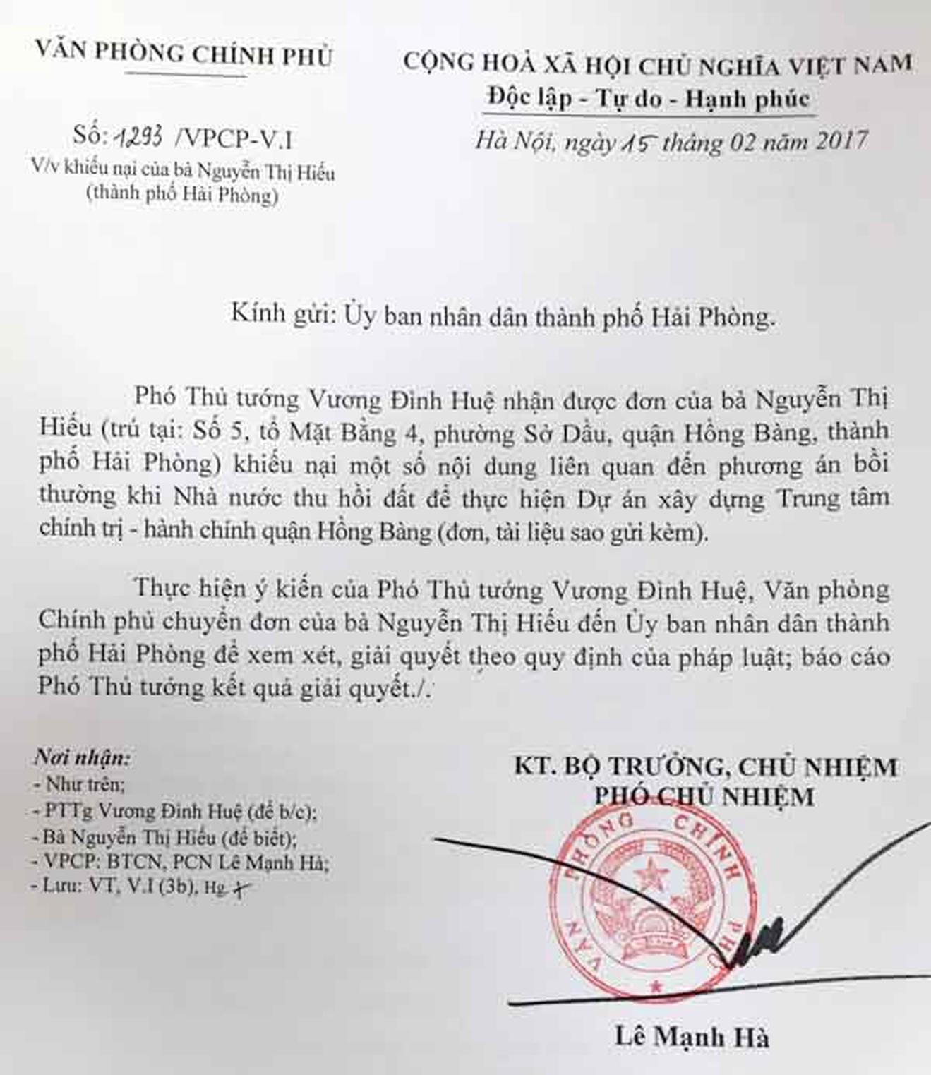 Văn bản số 1293/VBCP-V.I nêu rõ: Thực hiện ý kiến của Phó Thủ tướng Vương Đình Huệ, Văn phòng Chính phủ chuyển đơn của bà Nguyễn Thị Hiếu đến UBND TP Hải Phòng để xem xét, giải quyết theo quy định của pháp luật; báo cáo Phó Thủ tướng kết quả giải quyết.