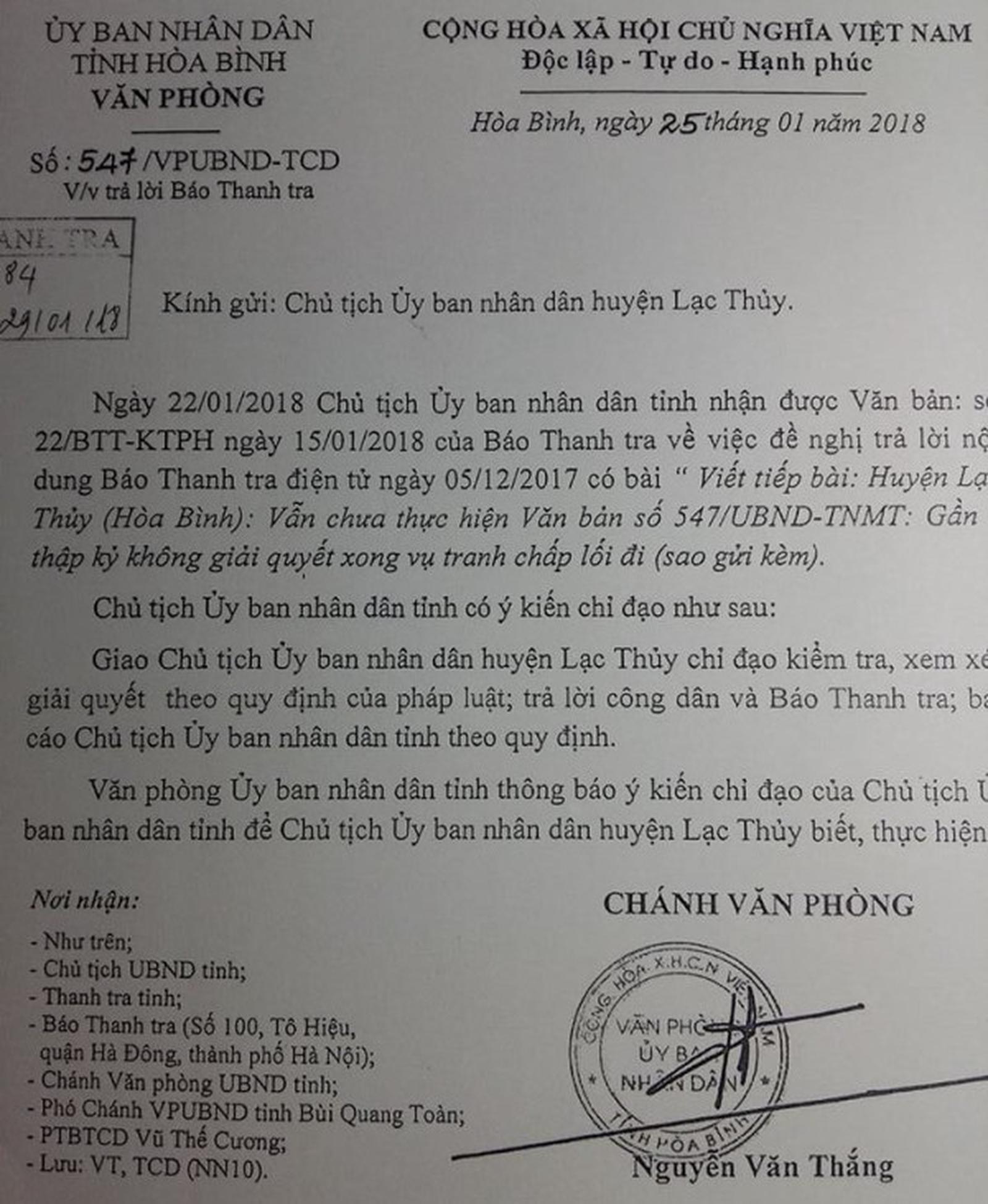 Ngày 25/1/2018, Văn phòng UBND tỉnh tiếp tục có Văn bản số 547/VPUBND-TCD truyền đạt ý kiến chỉ đạo của Chủ tịch UBND tỉnh: Giao Chủ tịch UBND huyện Lạc Thủy chỉ đạo kiểm tra, xem xét, giải quyết theo quy định của pháp luật; trả lời công dân và Báo Thanh tra; báo cáo Chủ tịch UBND tỉnh theo quy định.