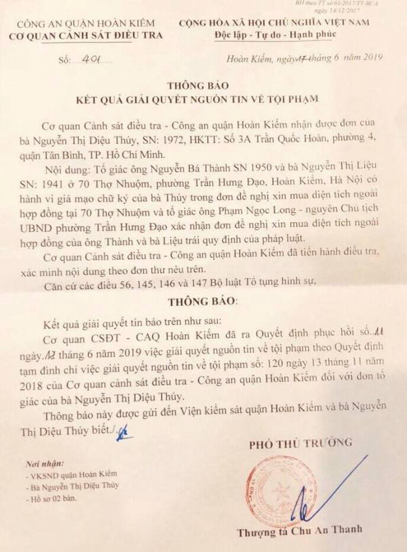 Theo đó, Cơ quan CSĐT Công an quận Hoàn Kiếm đã ra Quyết định phục hồi số 11 ngày 12/6/2019, về việc giải quyết nguồn tin tội phạm theo Quyết định tạm đình chỉ việc giải quyết nguồn tin về tội phạm số 120 ngày 13/11/2018 của Cơ quan CSĐT Công an quận Hoàn Kiếm, đối với đơn tố giác của bà Nguyễn Thị Diệu Thúy.