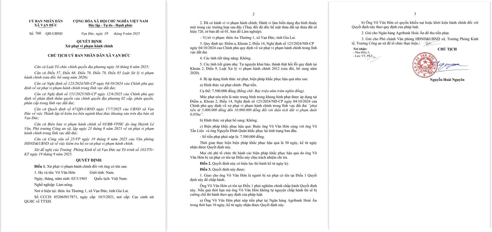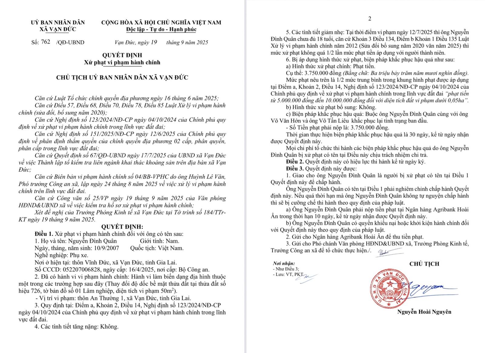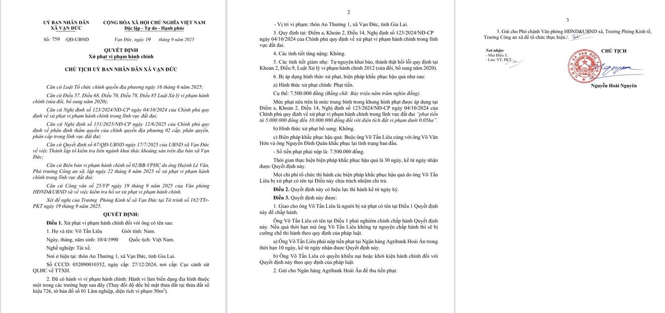 Ngày 19/9/2025, Chủ tịch UBND xã Vạn Đức đã ban hành 3 quyết định xử phạt vi phạm hành chính đối với các cá nhân có liên quan.