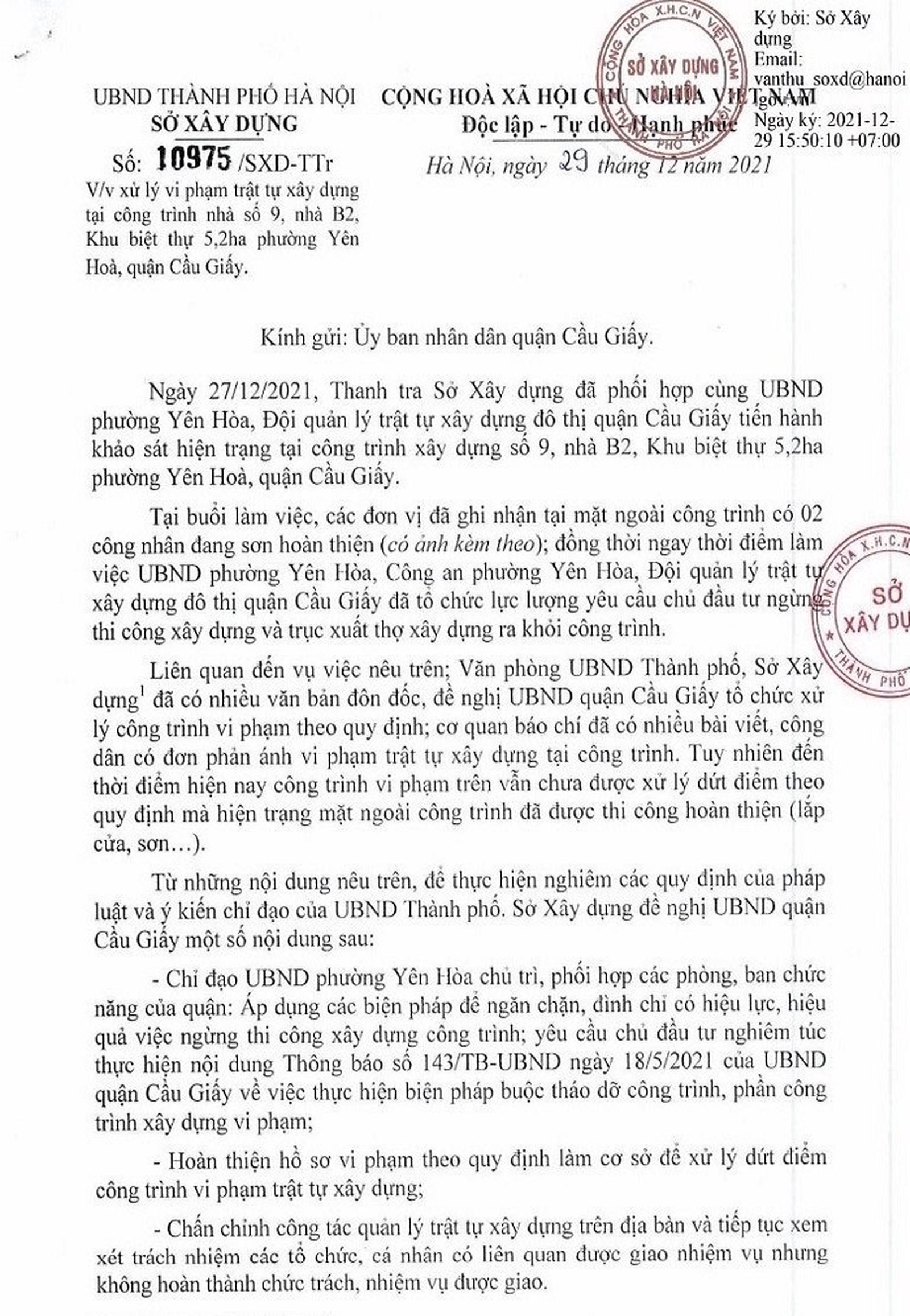Trước đó, ngày 29/12/2021, Sở Xây dựng Hà Nội cũng đã có Văn bản số 10975 đề nghị UBND quận Cầu Giấy chỉ đạo UBND phường Yên Hòa chủ trì, phối hợp với các phòng, ban chức năng của quận áp dụng các biện pháp để ngăn chặn, đình chỉ có hiệu lực, hiệu quả việc ngừng thi công xây dựng công trình; yêu cầu chủ đầu tư nghiêm túc thực hiện nội dung Thông báo số 143 ngày 18/5/2021 của UBND quận Cầu Giấy về việc thực hiện biện pháp buộc tháo dỡ công trình, phần công trình xây dựng vi phạm tại công trình số 9 nhà B, khu biệt thự 5,2ha. Hoàn thiện hồ sơ vi phạm theo quy định là cơ sở để xử lý dứt điểm công trình vi phạm TTXD.
