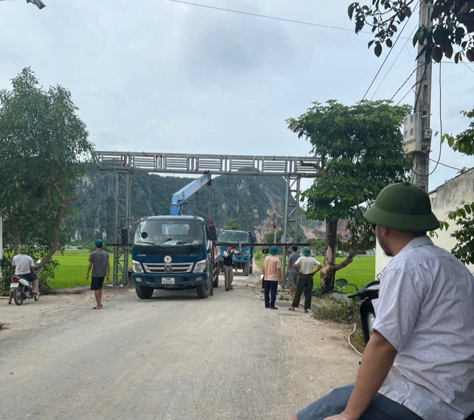 Lực lượng chức năng xã Đông Phú làm khung khống chế tải trọng nhằm hạn chế xe bồn chở bê tông từ 2 trạm trộn bê tông trái phép. Ảnh: VT
