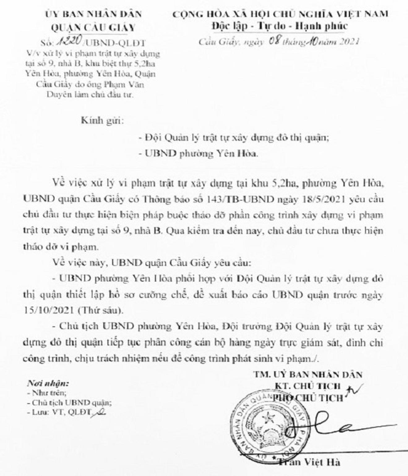 Văn bản cho thấy, việc xử lý vi phạm TTXD tại khu biệt thự 5,2ha phường Yên Hòa, quận Cầu Giấy, ngày 18/5/2021, UBND quận đã có Thông báo số 143 yêu cầu chủ đầu tư thực hiện biện pháp buộc tháo dỡ phần công trình xây dựng vi phạm TTXD tại số 9, nhà B. Qua kiểm tra đến nay, chủ đầu tư chưa thực hiện tháo dỡ phần vi phạm.