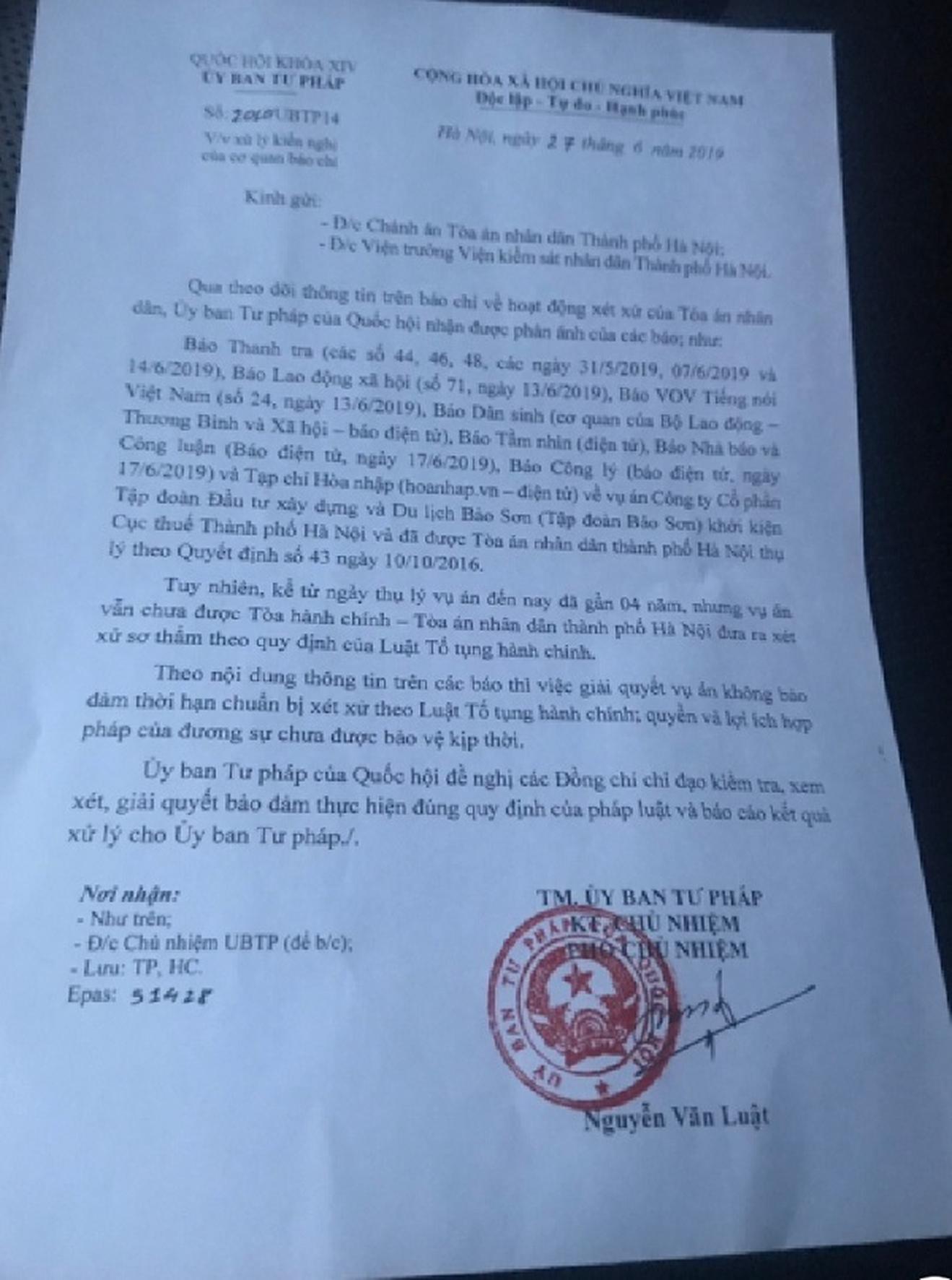 Ngày 27/6/2019, Ủy ban Tư pháp Quốc hội Khóa XIV đã có Công văn số 2010-UBTP14 (v/v xử lý kiến nghị của cơ quan báo chí) gửi TAND và Viện KSND TP HN kiểm tra, xem xét, giải quyết, bảo đảm thực hiện đúng quy định của pháp luật và báo cáo kết quả.