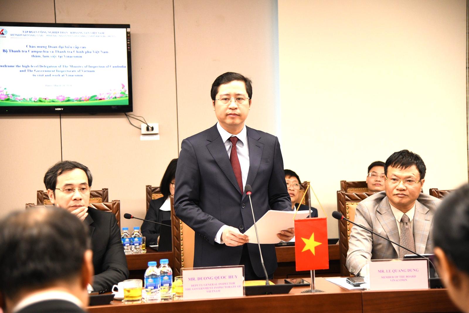 Phát biểu tại buổi làm việc, Phó Tổng Thanh tra Dương Quốc Huy bày tỏ vinh dự được cùng bà Quốc vụ khanh Thường trực và Đoàn Đại biểu cấp cao Bộ Thanh tra Campuchia đến thăm làm việc với TKV.