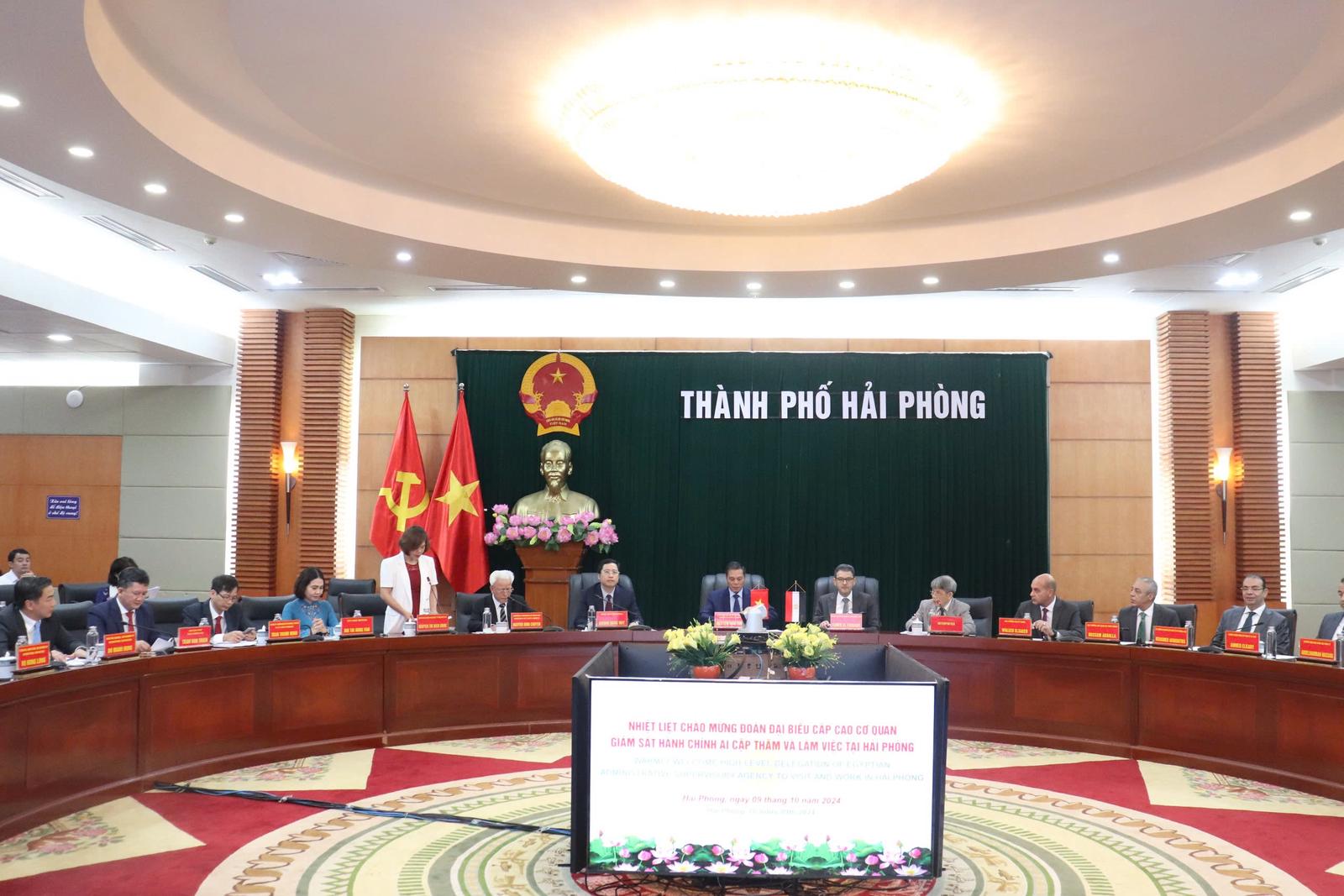 (Thanh tra) - Ngày 9/10, Đoàn Đại biểu cấp cao Cơ quan Giám sát Hành chính Ai Cập do ông Ta-me En Fa-ga-ny, Phó Chủ tịch Cơ quan Giám sát Hành chính Ai Cập làm Trưởng đoàn, đã đến thăm và làm việc tại UBND thành phố Hải Phòng.