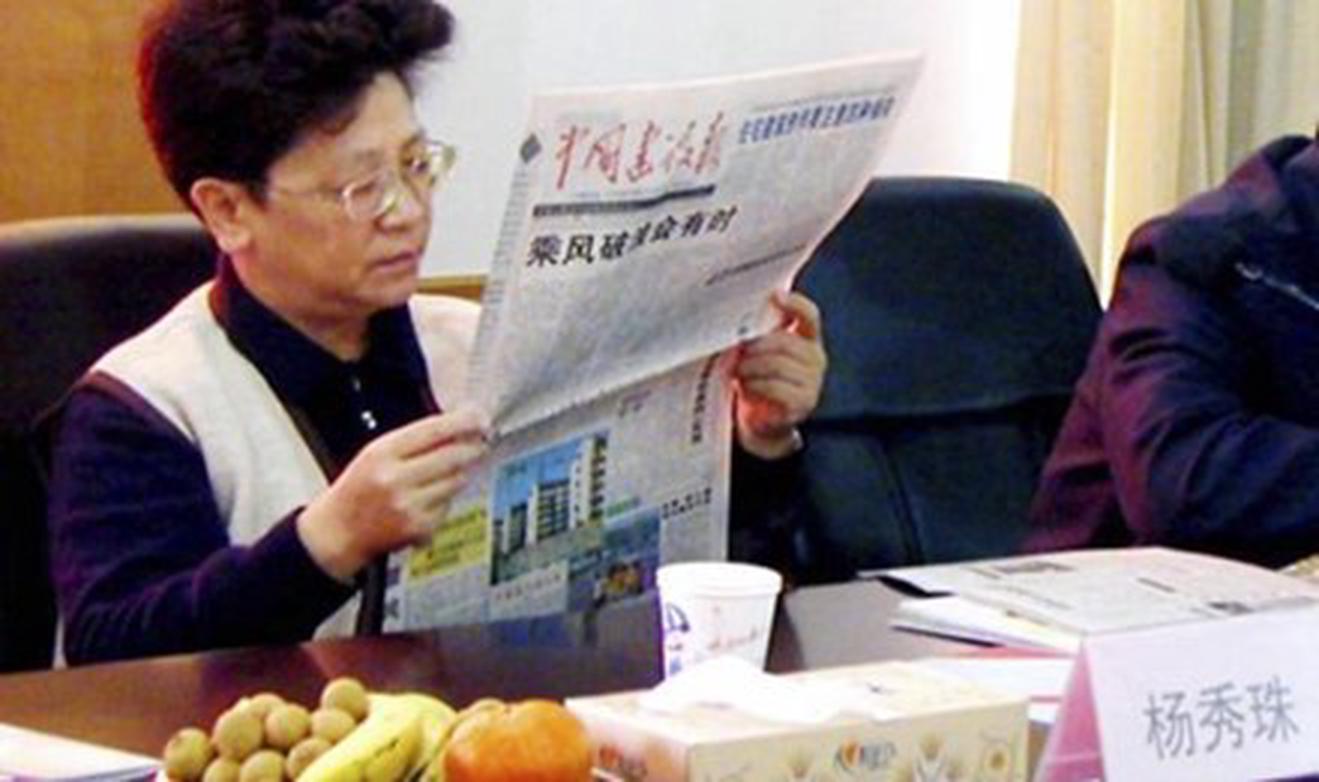 Ảnh chụp bà Dương Tú Châu ngồi đọc báo trong phòng họp tại tỉnh Chiết Giang vào ngày 29.12.2001. Ảnh: Reuters