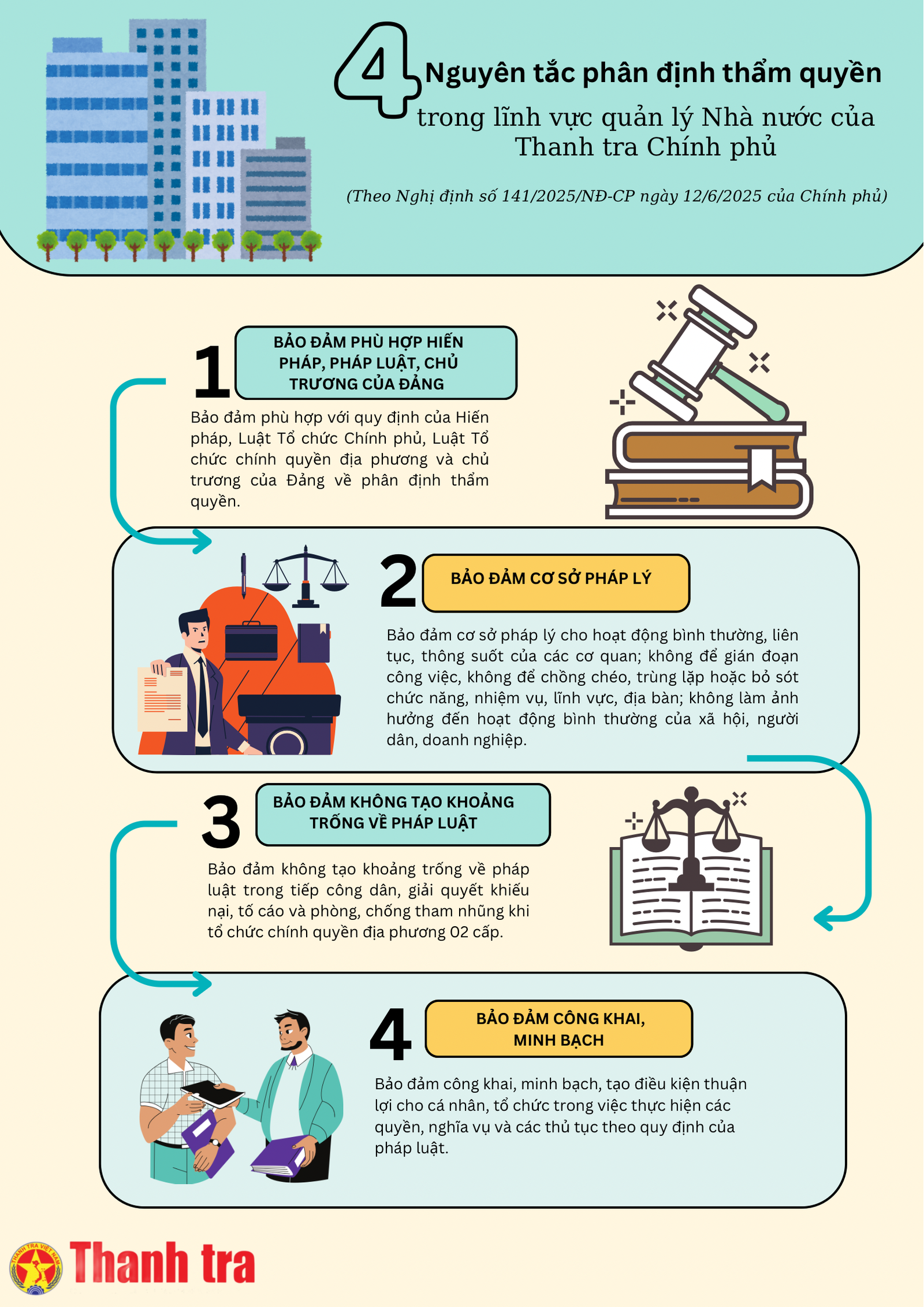 (Thanh tra) - Nghị định 141/2025/NĐ-CP ngày 12/6/2025 của Chính phủ quy định về phân định thẩm quyền của chính quyền địa phương 2 cấp trong lĩnh vực quản lý Nhà nước của Thanh tra Chính phủ, đặt ra 4 nguyên tắc cơ bản nhằm bảo đảm quản lý thống nhất, hiệu lực và hiệu quả.