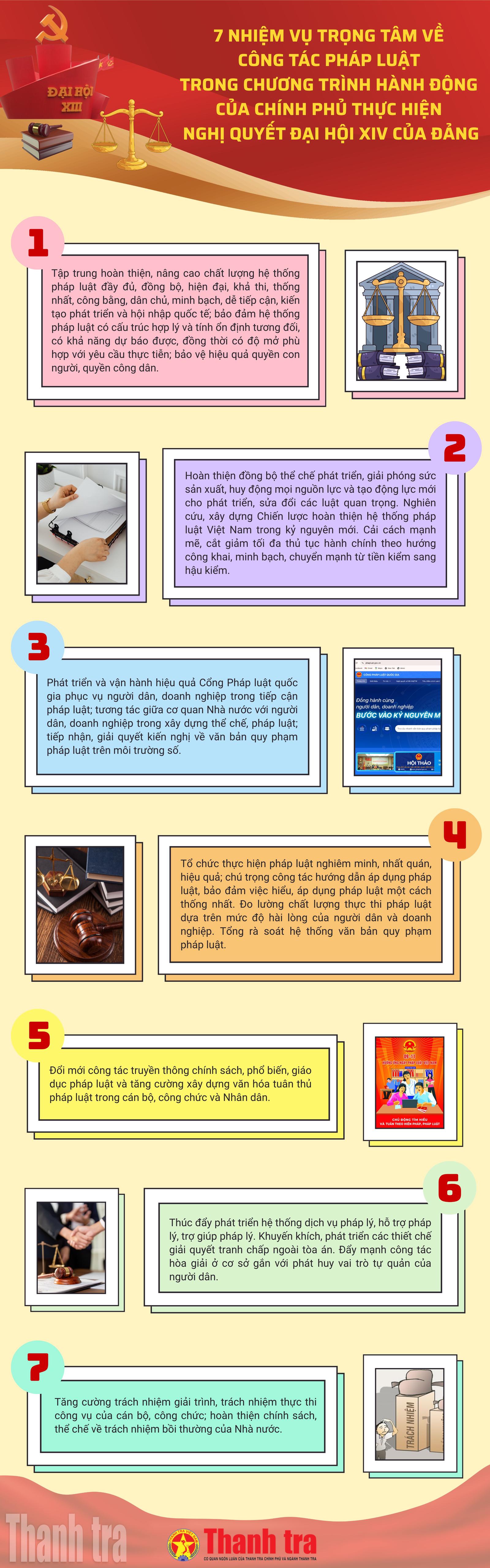 (Thanh tra) - Nghị quyết Đại hội XIV của Đảng đã nhấn mạnh vai trò của thể chế và pháp luật. Pháp luật không chỉ là công cụ quản lý mà phải trở thành nền tảng ổn định, động lực phát triển và lợi thế cạnh tranh quốc gia. Chính phủ đã đề ra 7 nhiệm vụ trọng tâm về công tác pháp luật trong chương trình hành động thực hiện Nghị quyết Đại hội XIV của Đảng.