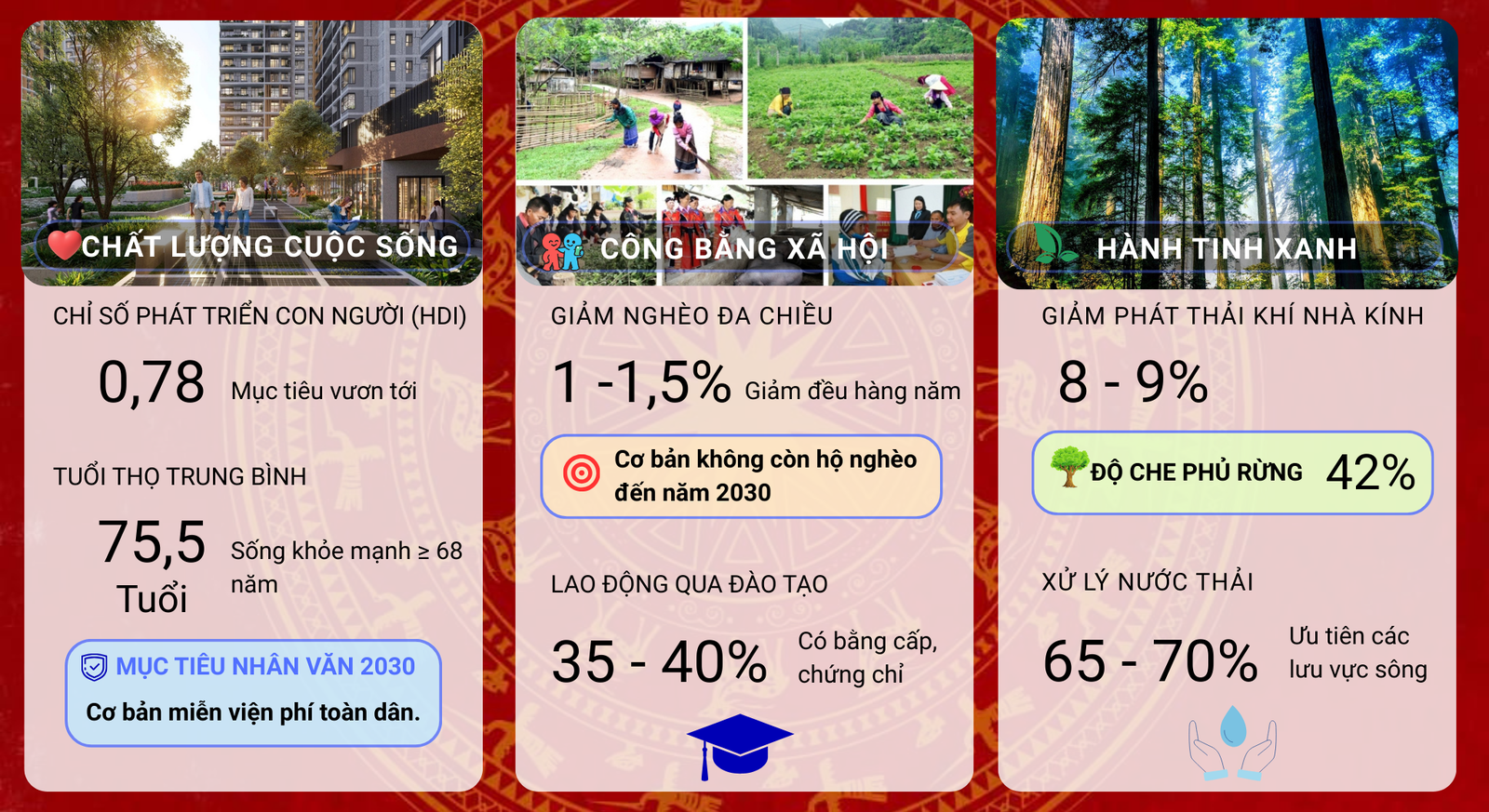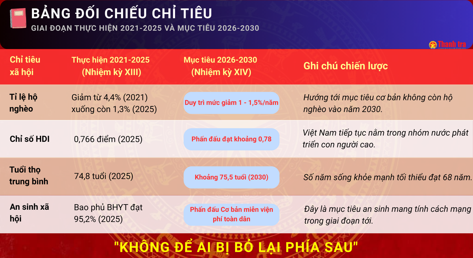 (Thanh tra) - Lấy "Dân là gốc", Đại hội XIV của Đảng kiến tạo lộ trình phát triển bao trùm, nơi thành quả kinh tế chuyển hóa trực tiếp thành chất lượng sống. Từ mục tiêu "cơ bản không còn hộ nghèo" đến đột phá "miễn viện phí toàn dân", Việt Nam đang nâng tầm các chỉ số hạnh phúc và an sinh xã hội vượt trội so với giai đoạn 2021 - 2025. Mọi quyết sách đều hướng tới mục tiêu cao nhất: Nhân dân được thụ hưởng cuộc sống phồn vinh, văn minh và an toàn.