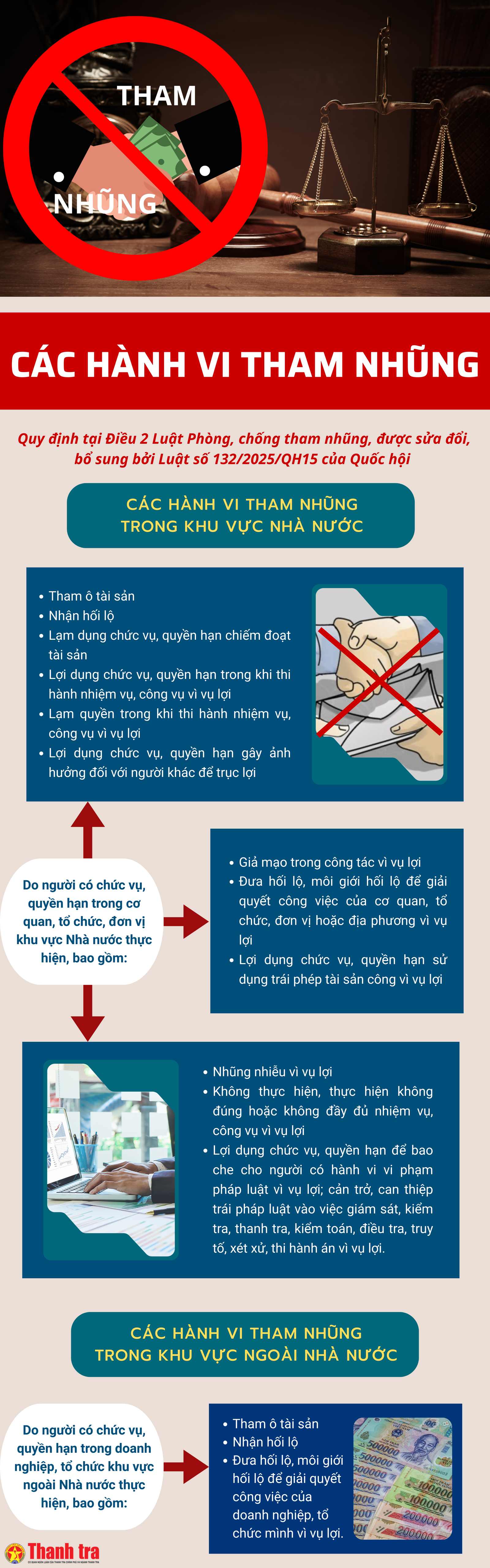 (Thanh tra) - Theo Luật Phòng, chống tham nhũng, được sửa đổi, bổ sung bởi Luật số 132/2025/QH15 của Quốc hội sửa đổi, bổ sung một số điều của Luật Phòng, chống tham nhũng, có hiệu lực kể từ ngày 01/7/2026, các hành vi tham nhũng được quy định cụ thể tại Điều 2, gồm: Các hành vi tham nhũng trong khu vực Nhà nước; các hành vi tham nhũng trong khu vực ngoài Nhà nước.