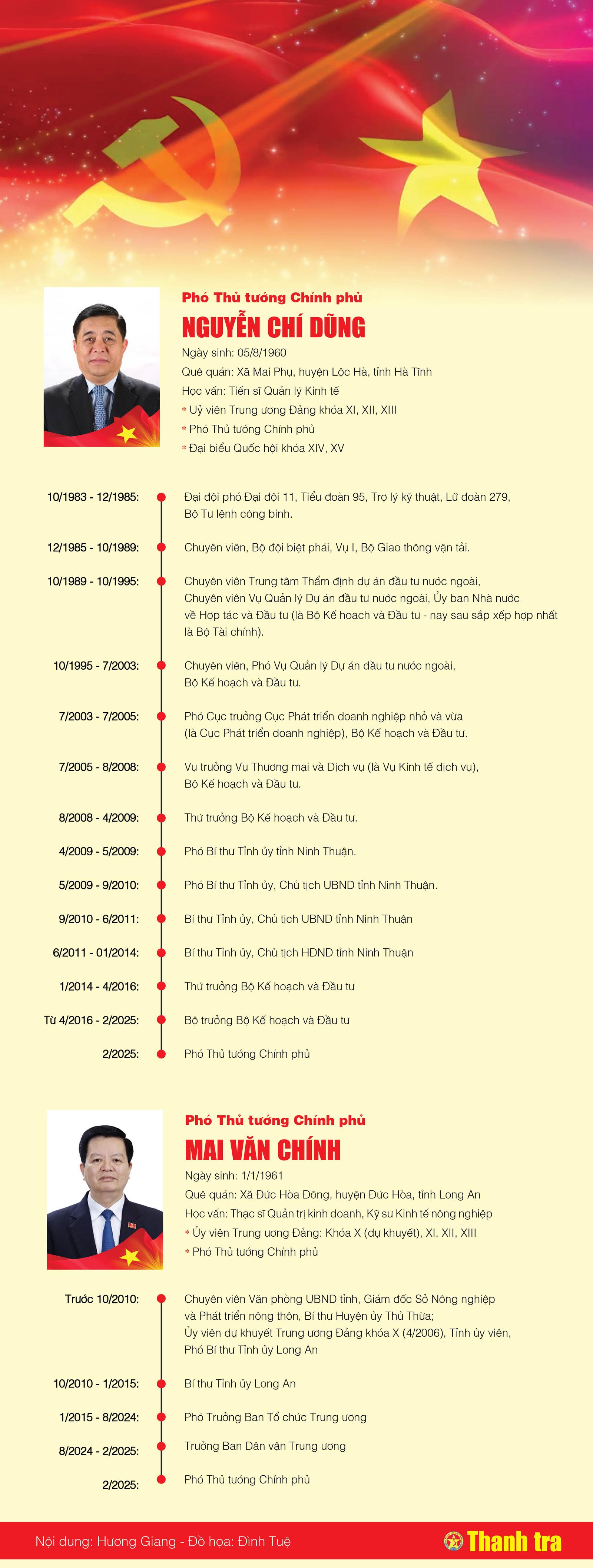 (Thanh tra) - Tân Phó Thủ tướng Nguyễn Chí Dũng có thời gian dài làm việc gắn bó với ngành kế hoạch và đầu tư. Còn tân Phó Thủ tướng Mai Văn Chính trưởng thành từ chuyên viên văn phòng ở tỉnh Long An, kinh qua nhiều chức vụ khác nhau ở địa phương và Trung ương.