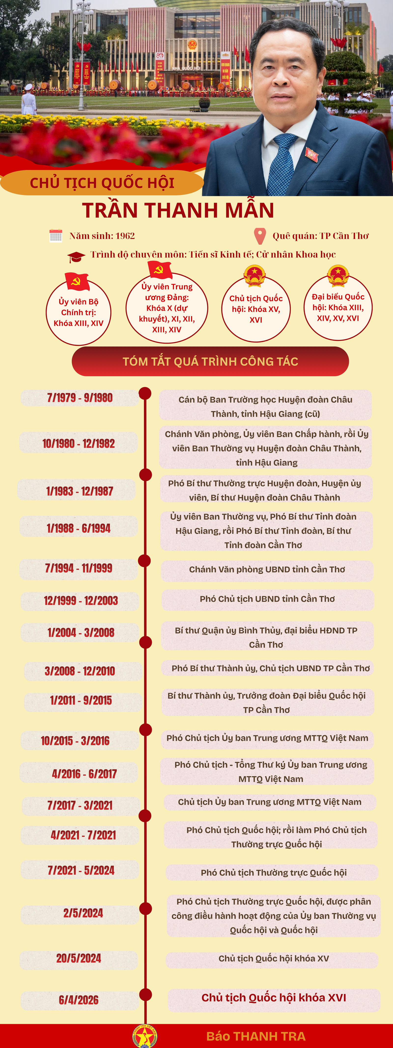 (Thanh tra) - Trưởng thành từ cán bộ đoàn, ông Trần Thanh Mẫn lần lượt kinh qua các chức vụ quan trọng như Bí thư Thành ủy Cần Thơ, Chủ tịch Ủy ban Trung ương Mặt trận Tổ quốc Việt Nam, trước khi được bầu làm Chủ tịch Quốc hội khóa XV và tái đắc cử khóa XVI.