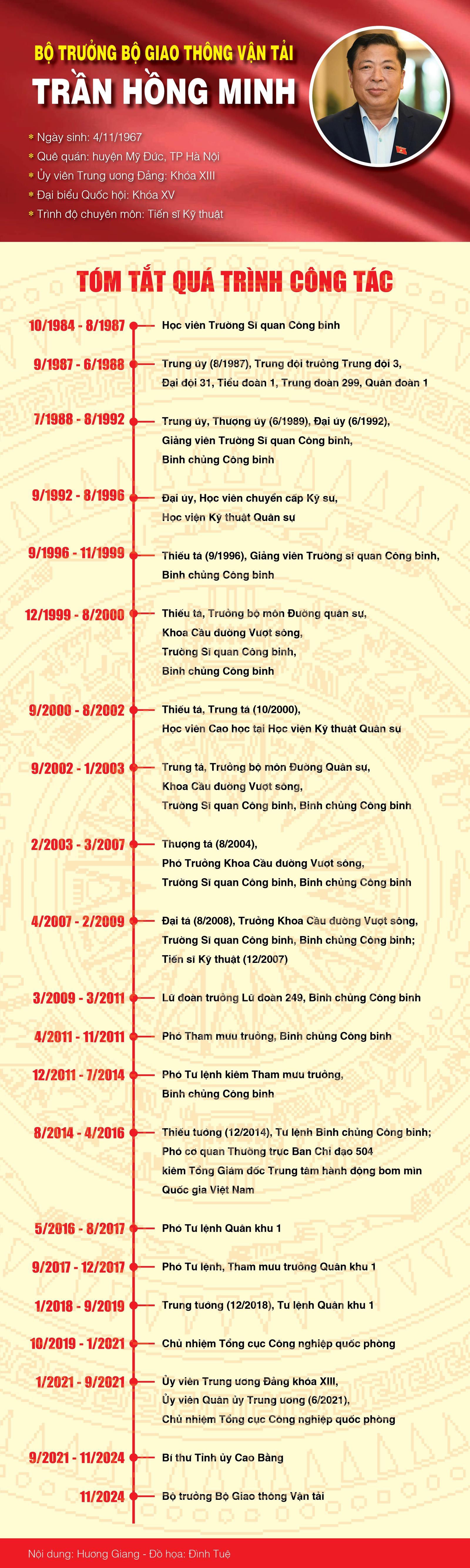 (Thanh tra) - Ông Trần Hồng Minh là Tiến sĩ Kỹ thuật, có thời gian dài học tập, công tác gắn với ngành công binh. Trước khi được phê chuẩn bổ nhiệm làm Bộ trưởng Bộ Giao thông Vận tải, ông Trần Hồng Minh là Bí thư Tỉnh ủy Cao Bằng.