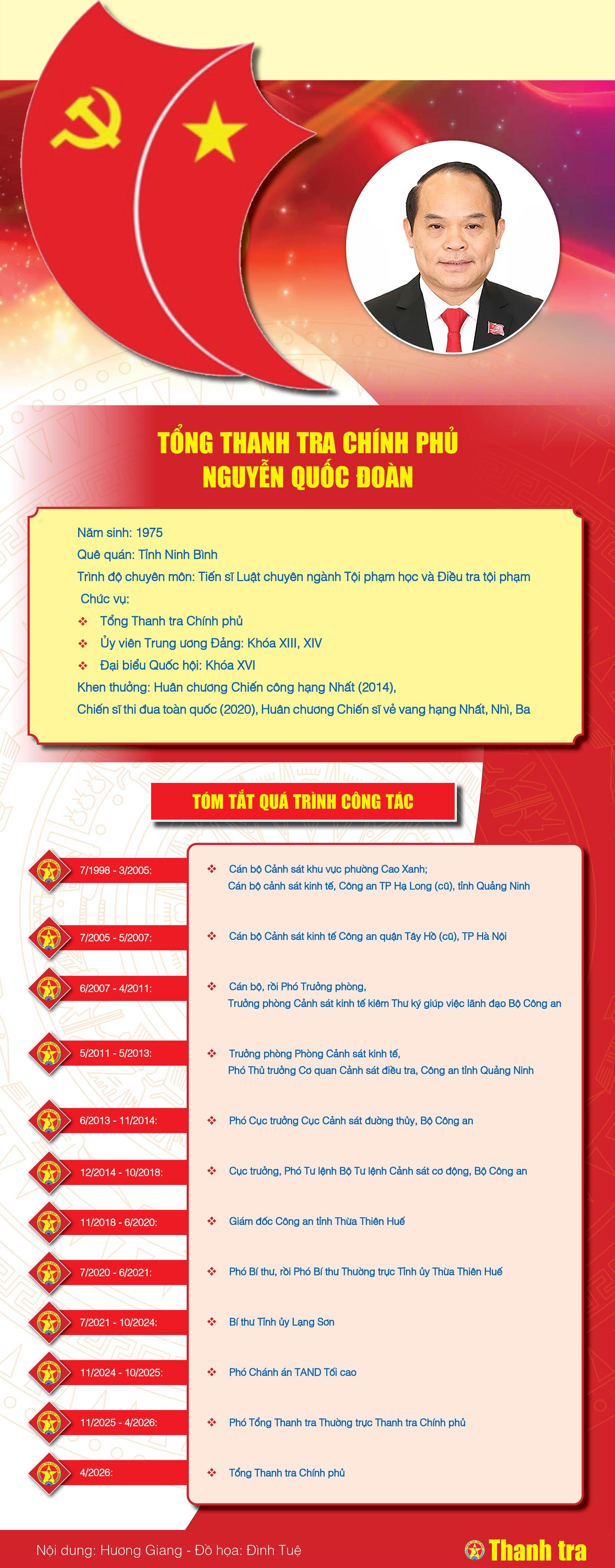 (Thanh tra) - Tân Tổng Thanh tra Chính phủ Nguyễn Quốc Đoàn là cán bộ được đào tạo bài bản. Ông từng kinh qua nhiều chức vụ khác nhau ở Trung ương và địa phương như Giám đốc Công an, rồi Phó Bí thư Tỉnh ủy Thừa Thiên Huế (nay là TP Huế); Bí thư Tỉnh ủy Lạng Sơn; Phó Chánh án TAND Tối cao; Phó Tổng Thanh tra Thường trực.