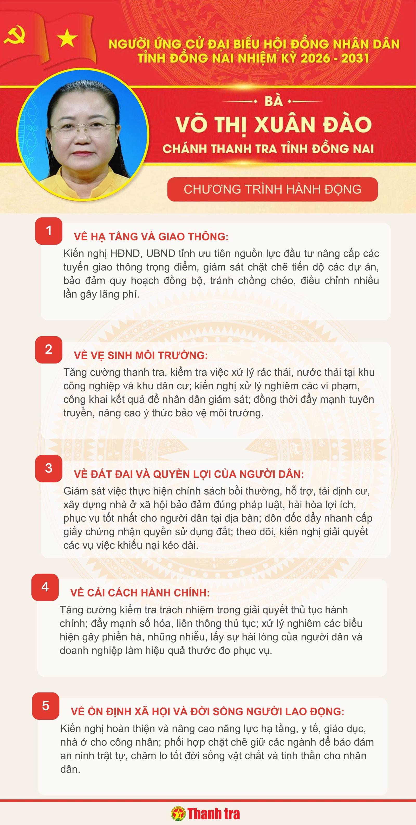 Theo danh sách những người ứng cử đại biểu HĐND tỉnh Đồng Nai nhiệm kỳ 2026 - 2031, bà Võ Thị Xuân Đào, Bí thư Đảng ủy, Chánh Thanh tra tỉnh Đồng Nai, được giới thiệu ứng cử đại biểu HĐND tỉnh tại đơn vị bầu cử số 3.