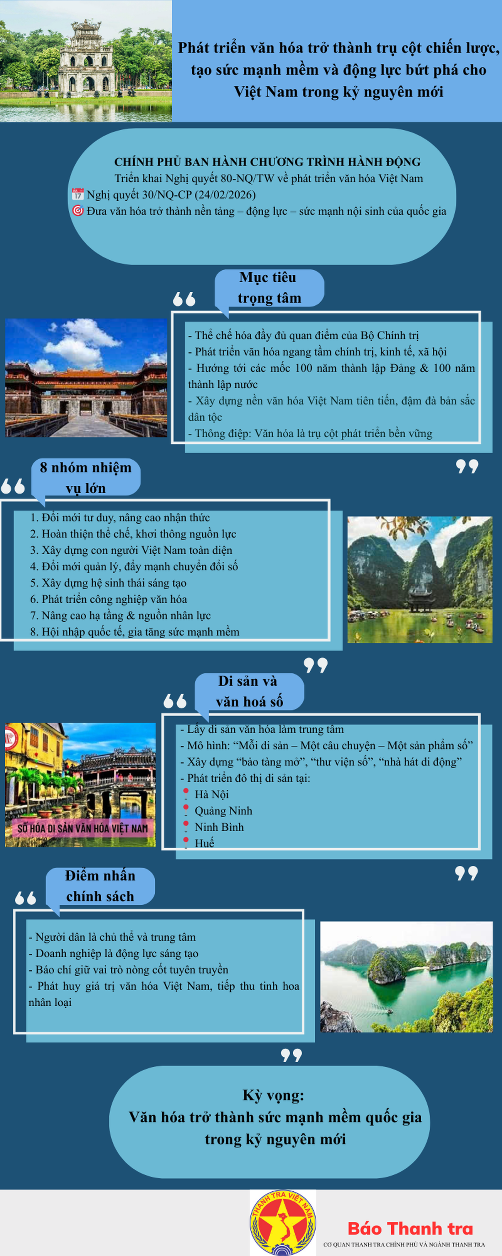 (Thanh tra) - Chính phủ ban hành Nghị quyết 30/NQ-CP triển khai Nghị quyết 80-NQ/TW của Bộ Chính trị về phát triển văn hóa Việt Nam. Chương trình hành động xác định 8 nhóm nhiệm vụ trọng tâm, nhằm đưa văn hóa trở thành nền tảng tinh thần, sức mạnh nội sinh và động lực bứt phá trong kỷ nguyên mới.
