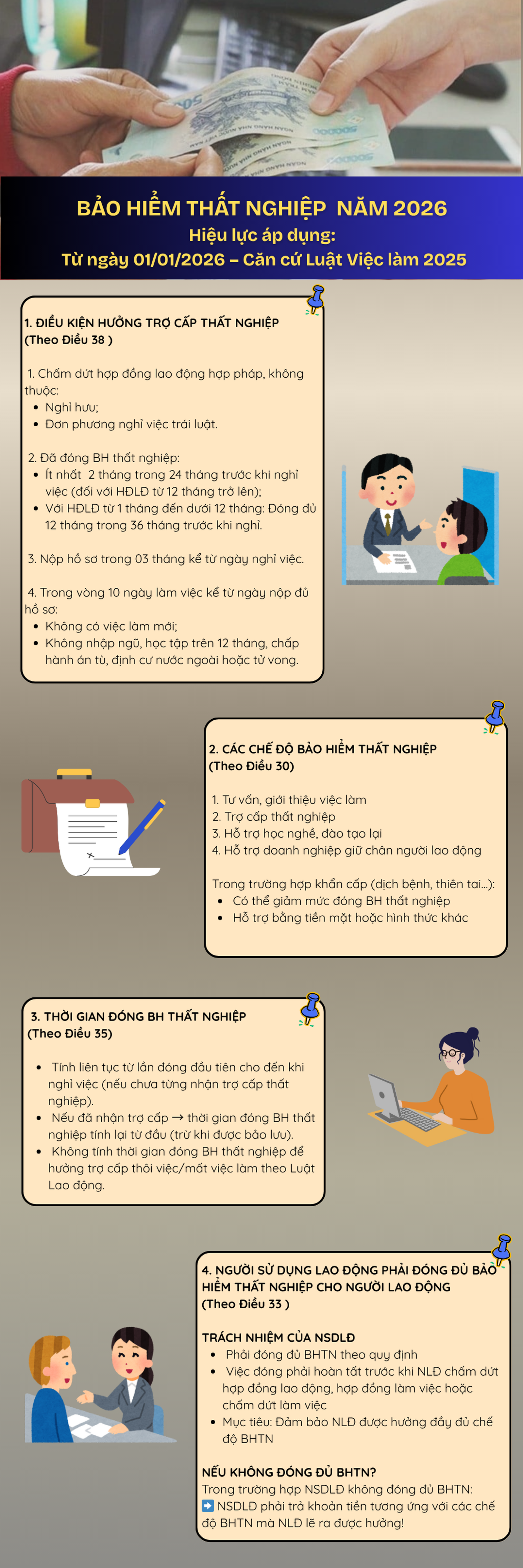 (Thanh tra) - Luật Việc làm 2025 có hiệu lực từ 1/1/2026 bổ sung nhiều chính sách mới về bảo hiểm thất nghiệp, nhấn mạnh hỗ trợ nghề nghiệp, giữ chân người lao động và trợ cấp linh hoạt trong tình huống khẩn cấp như dịch bệnh, thiên tai.