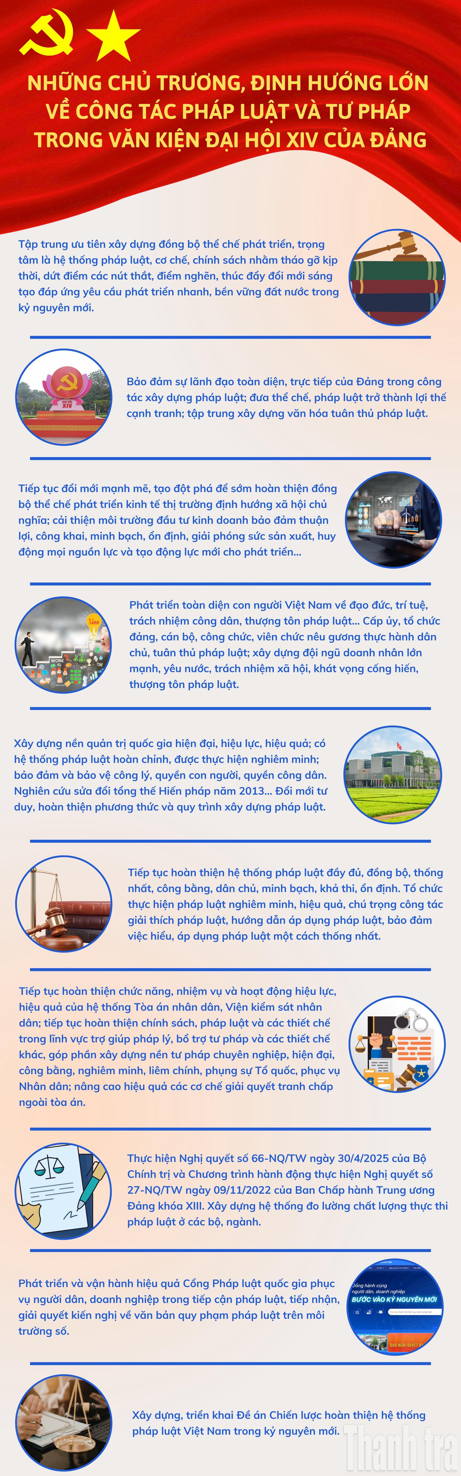 (Thanh tra) - Tập trung ưu tiên xây dựng đồng bộ thể chế phát triển; bảo đảm sự lãnh đạo toàn diện, trực tiếp của Đảng trong công tác xây dựng pháp luật… là những chủ trương, định hướng lớn về công tác pháp luật và tư pháp trong Văn kiện Đại hội XIV của Đảng.