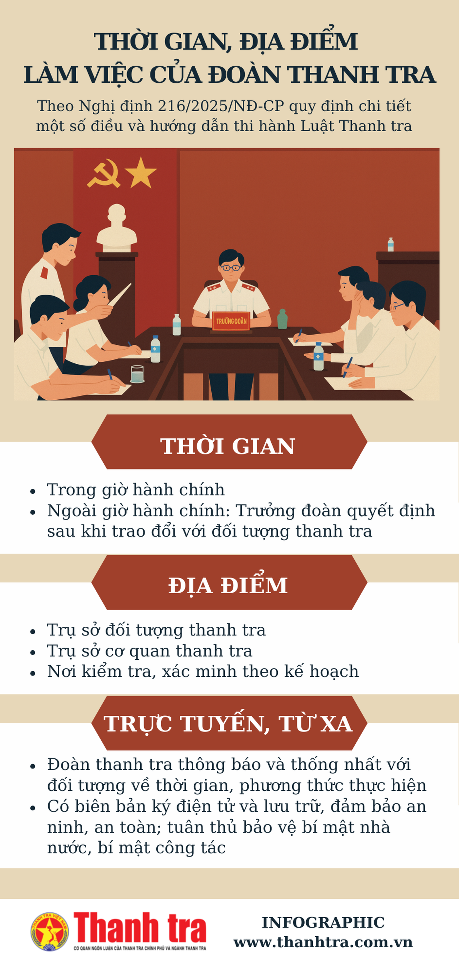 (Thanh tra) - Địa điểm, thời gian làm việc của Đoàn thanh tra đã quy định tại Điều 65 Luật Thanh tra năm 2025 và được chi tiết tại Điều 31, Nghị định số 216/2025/NĐ-CP ngày 5/8/2025 của Chính phủ, bao gồm làm việc trực tuyến, từ xa.