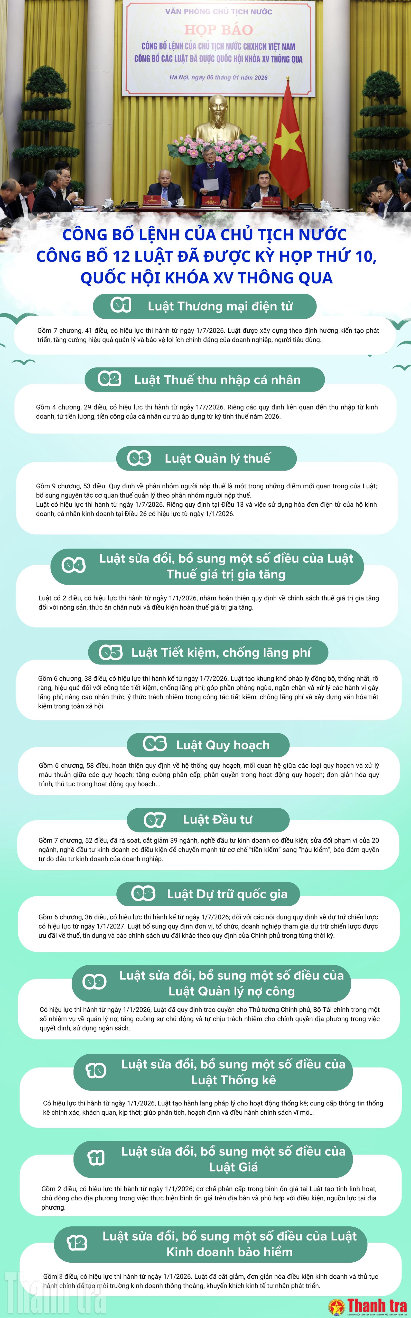(Thanh tra) - Ngày 6/1, Văn phòng Chủ tịch nước tổ chức họp báo công bố Lệnh của Chủ tịch nước công bố 12 luật đã được Kỳ họp thứ 10, Quốc hội khóa XV thông qua. Đây là những luật liên quan đến lĩnh vực kinh tế với nhiều điểm mới quan trọng.