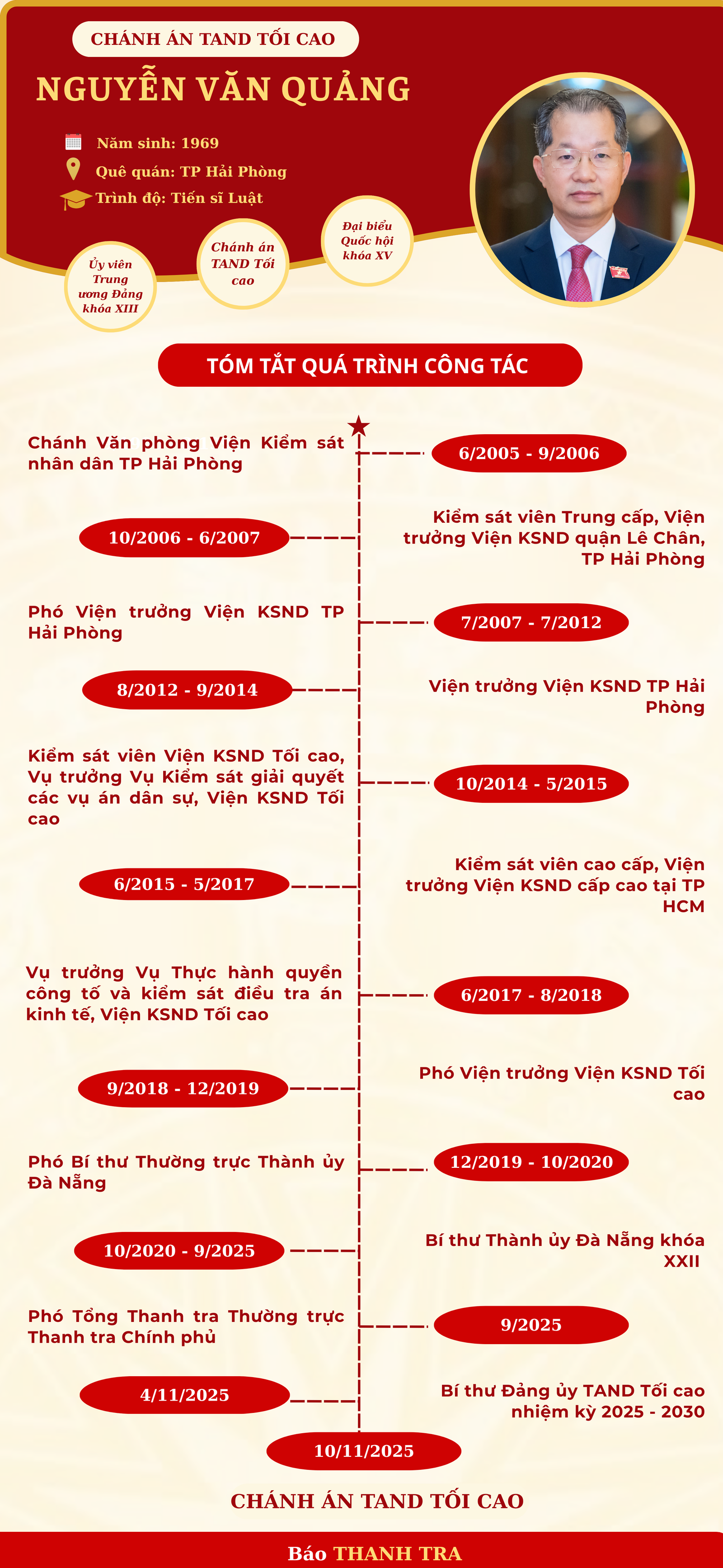 (Thanh tra) - Tân Chánh án TAND Tối cao Nguyễn Văn Quảng là cán bộ có nhiều năm công tác gắn liền với ngành kiểm sát. Ông từng kinh qua các vị trí như Phó Viện trưởng Viện KSND Tối cao, Bí thư Thành ủy Đà Nẵng, Phó Tổng Thanh tra Thường trực Thanh tra Chính phủ…