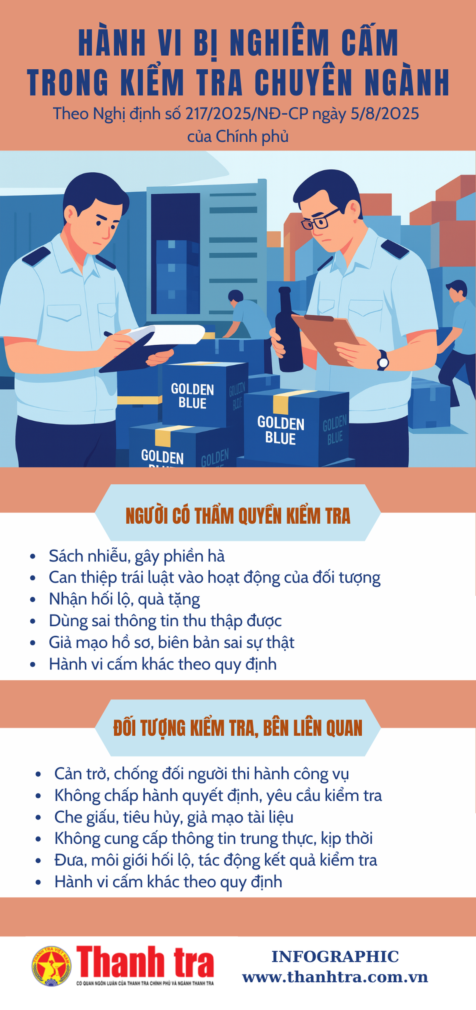 (Thanh tra) - Theo Luật Thanh tra, từ 1/7/2025, Thủ trưởng cơ quan quản lý nhà nước có trách nhiệm tổ chức kiểm tra việc chấp hành chính sách, pháp luật của cơ quan, tổ chức, cá nhân thuộc phạm vi quản lý; nếu phát hiện vi phạm thì áp dụng hoặc kiến nghị biện pháp xử lý, trường hợp cần thiết đề nghị cơ quan có thẩm quyền thanh tra. Nghị định 217/2025/NĐ-CP đã quy định cụ thể về hoạt động kiểm tra chuyên ngành, bao gồm các hành vi bị nghiêm cấm.