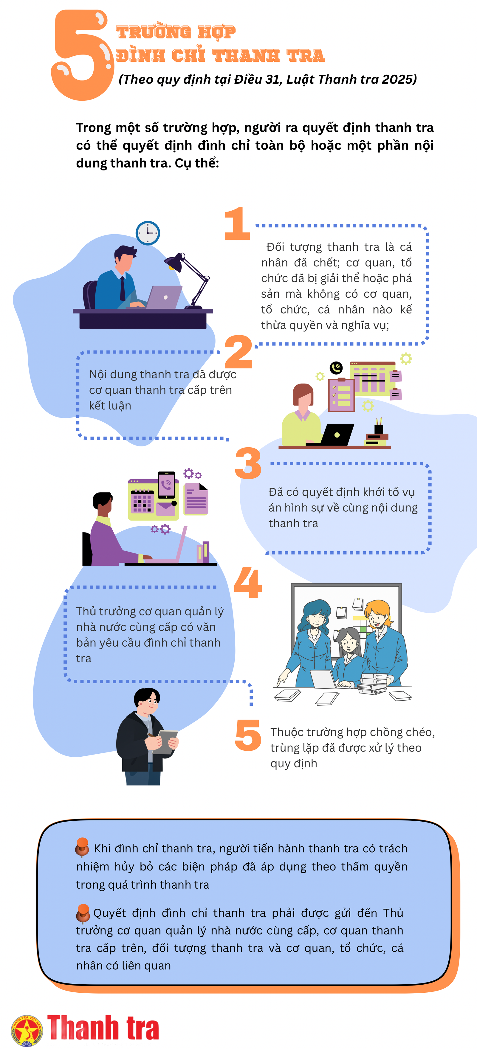(Thanh tra) - Điều 31, Luật Thanh tra 2025 quy định, trong một số trường hợp, người ra quyết định thanh tra có thể quyết định đình chỉ toàn bộ hoặc một phần nội dung thanh tra trong quyết định thanh tra.