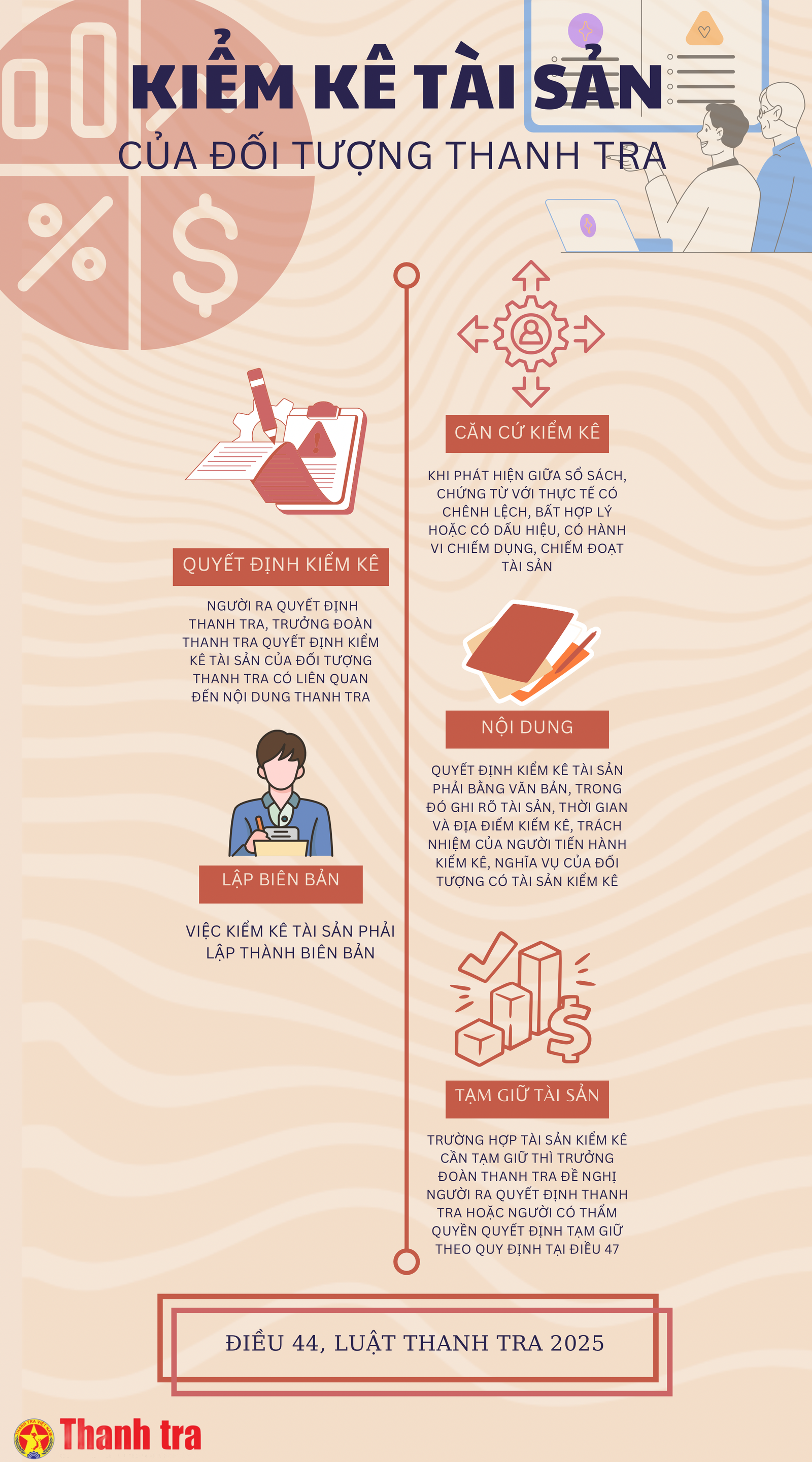 (Thanh tra) - Điều 44, Luật Thanh tra 2025 quy định, Trưởng đoàn thanh tra quyết định kiểm kê tài sản của đối tượng thanh tra có liên quan đến nội dung thanh tra khi phát hiện giữa sổ sách, chứng từ với thực tế có chênh lệch, bất hợp lý hoặc có dấu hiệu, có hành vi chiếm dụng, chiếm đoạt tài sản.