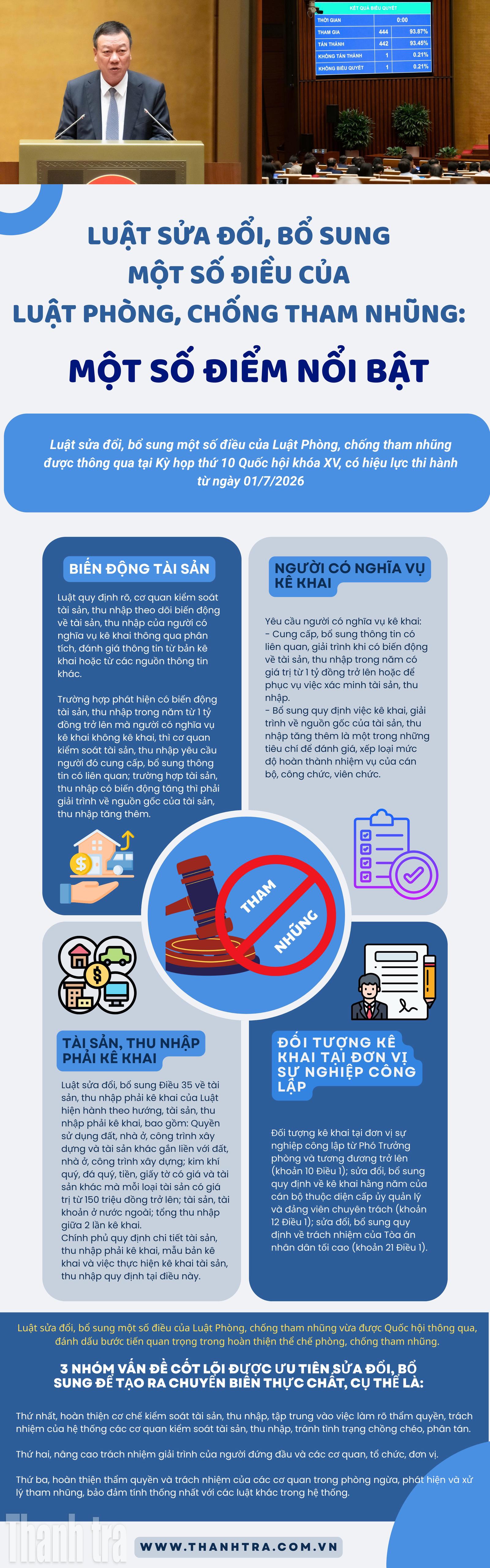 (Thanh tra) - Luật sửa đổi, bổ sung một số điều của Luật Phòng, chống tham nhũng đã được Quốc hội thông qua, trong đó có nhiều nội dung mới đáng chú ý, như: Làm rõ thẩm quyền, trách nhiệm của hệ thống các cơ quan kiểm soát tài sản, thu nhập; điều chỉnh biên độ giá trị tài sản, thu nhập phải kê khai; quy định chặt chẽ hơn về trách nhiệm giải trình; hoàn thiện thẩm quyền và trách nhiệm của các cơ quan trong phòng ngừa, phát hiện và xử lý tham nhũng…