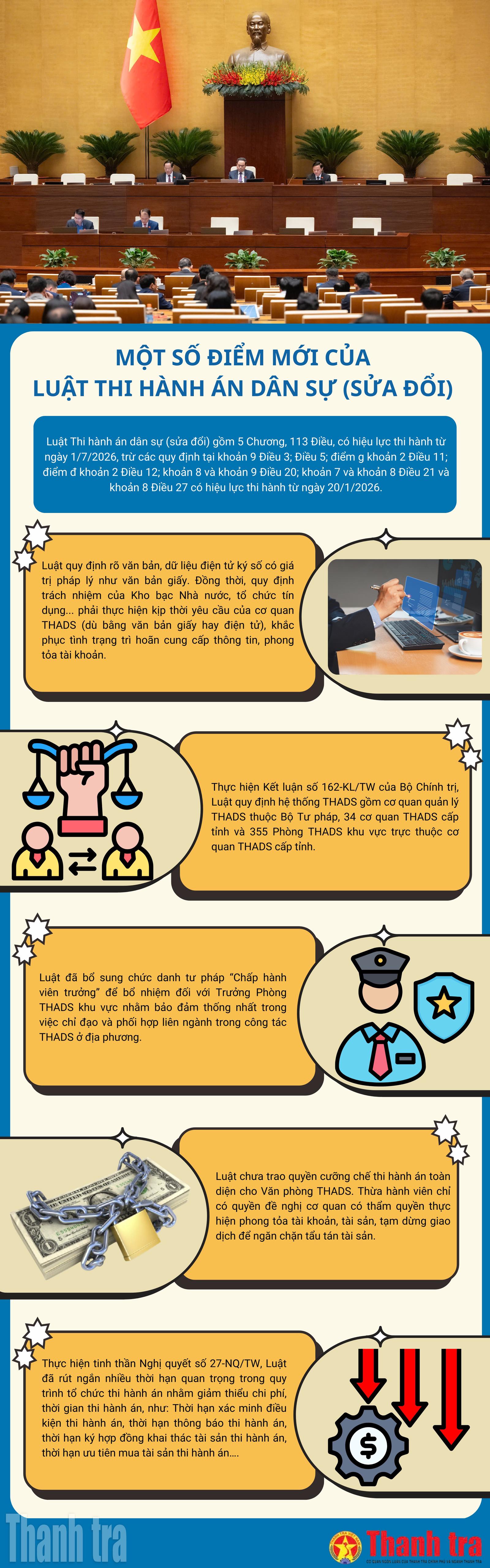 (Thanh tra) - Luật Thi hành án dân sự (sửa đổi) được Quốc hội thông qua ngày 5/12/2025 có nhiều điểm mới quan trọng sẽ tháo gỡ những vướng mắc về cơ chế, thủ tục, thúc đẩy mạnh mẽ quá trình chuyển đổi số trong hoạt động thi hành án dân sự, góp phần tăng cường hiệu lực, hiệu quả thi hành pháp luật, phục vụ tốt hơn quyền và lợi ích hợp pháp của tổ chức, cá nhân.
