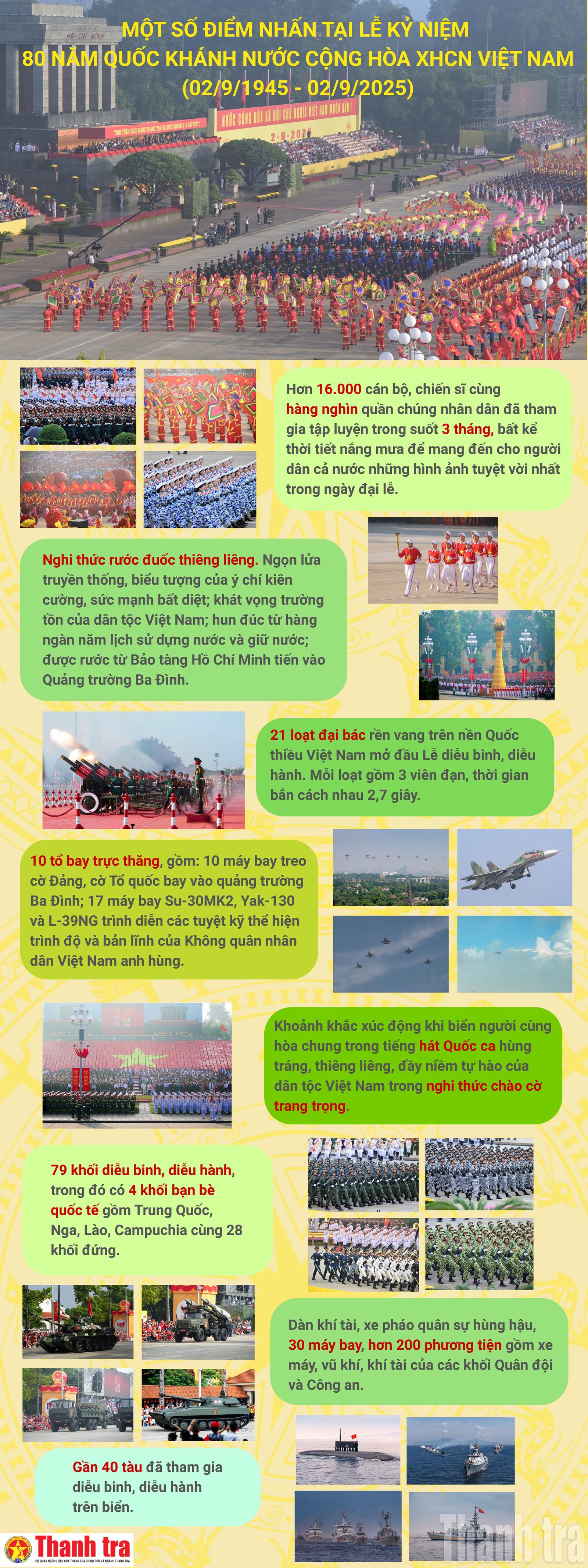 (Thanh tra) - Lễ Kỷ niệm 80 năm Cách mạng tháng Tám thành công (19/8/1945 - 19/8/2025) và Quốc khánh nước Cộng hòa xã hội chủ nghĩa Việt Nam (02/9/1945 - 02/9/2025) đã diễn ra trang trọng sáng 2/9 tại Quảng trường Ba Đình lịch sử. Những điểm nhấn tại Lễ kỷ niệm đã thể hiện sức mạnh, khí thế của dân tộc - một dân tộc kiên cường, bất khuất trong chiến tranh và bền bỉ, sáng tạo trong công cuộc dựng xây hòa bình hôm nay.