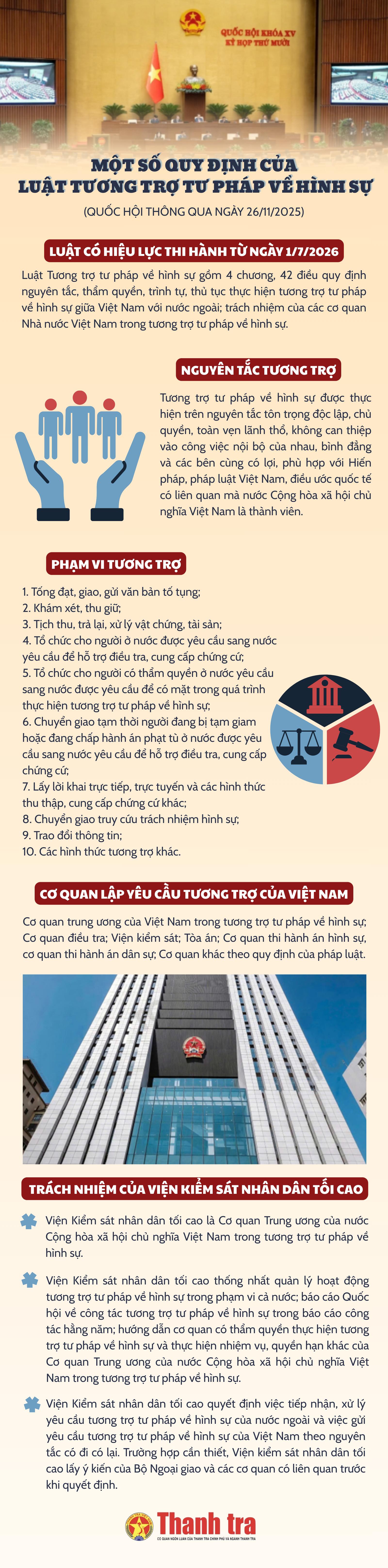 (Thanh tra) - Tương trợ tư pháp về hình sự là việc Việt Nam và nước ngoài, thông qua các cơ quan nhà nước có thẩm quyền, hỗ trợ nhau trong việc thực hiện các hoạt động xác minh, điều tra, thu thập chứng cứ...nhằm phục vụ giải quyết vụ việc, vụ án hình sự, thi hành án. Luật Tương trợ tư pháp về hình sự mới được Quốc hội thông qua, quy định Viện Kiểm sát nhân dân tối cao là Cơ quan Trung ương của Việt Nam trong tương trợ tư pháp về hình sự.