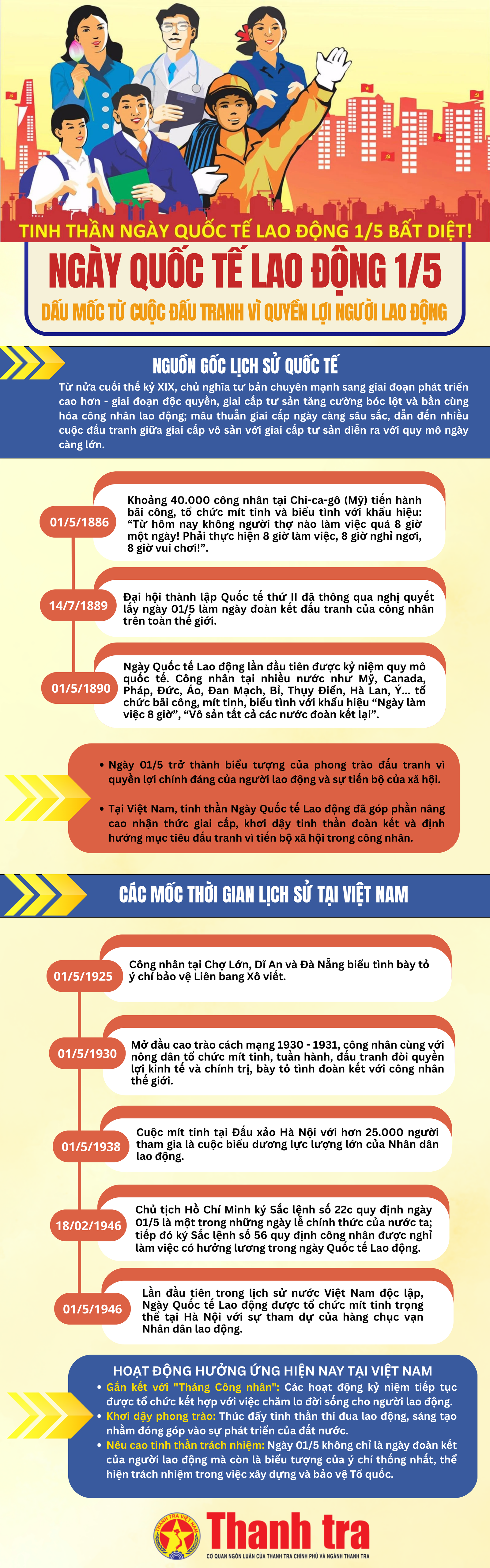 (Thanh tra) - Trải qua chặng đường lịch sử 140 năm, Ngày Quốc tế Lao động (1/5) không chỉ là biểu tượng đoàn kết của phong trào công nhân toàn cầu vì mục tiêu tiến bộ xã hội. Tại Việt Nam, ngày lễ này còn gắn liền với khát vọng độc lập, sự trưởng thành của giai cấp công nhân và ý chí quyết tâm xây dựng, bảo vệ Tổ quốc.