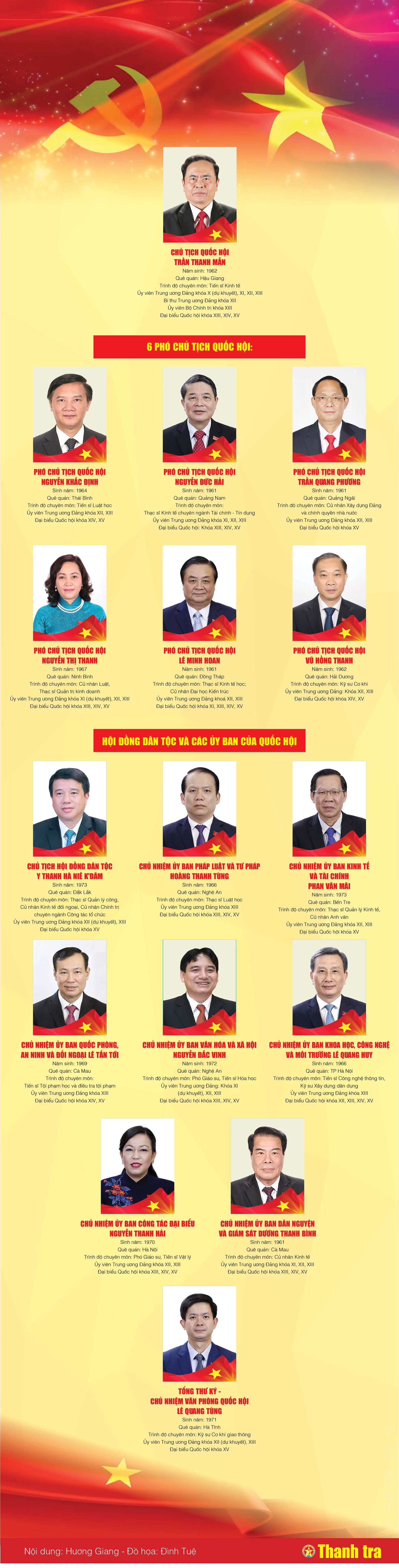(Thanh tra) - Sau sắp xếp tinh gọn bộ máy, nhân sự lãnh đạo Quốc hội có 16 thành viên, gồm Chủ tịch Quốc hội, 6 Phó Chủ tịch Quốc hội, Chủ tịch Hội đồng Dân tộc, 7 Chủ nhiệm các Ủy ban và Tổng Thư ký Quốc hội.