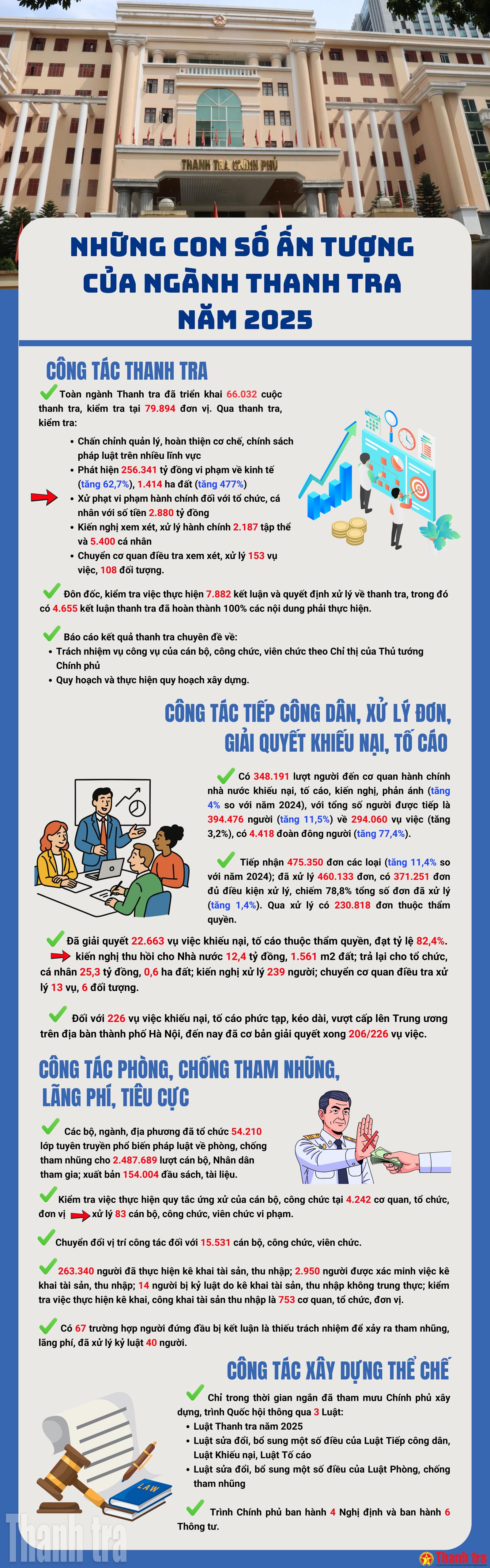 (Thanh tra) - Năm 2025 là giai đoạn cả hệ thống chính trị tập trung thực hiện cuộc cách mạng về tổ chức bộ máy, sắp xếp lại đơn vị hành chính các cấp và xây dựng tổ chức chính quyền địa phương 2 cấp. Thanh tra Chính phủ và ngành Thanh tra đã có nhiều nỗ lực vượt qua khó khăn, thách thức, hoàn thành tốt nhiệm vụ được giao với những kết quả ấn tượng.